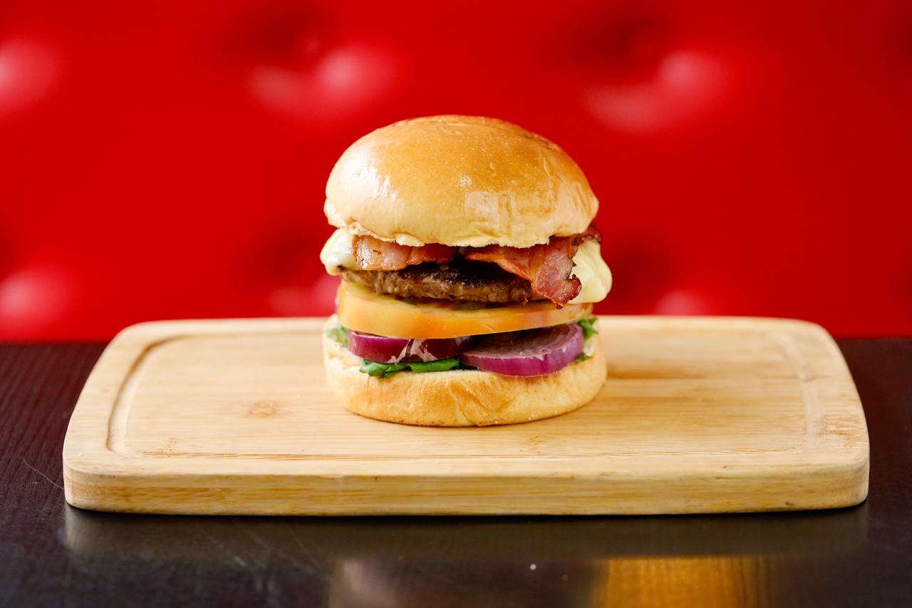PÃO BRIOCHE, HAMB BOVINO 180gr, MUSSARELA, BACON, CEBOLA ROXA, RÚCULA E TOMATE