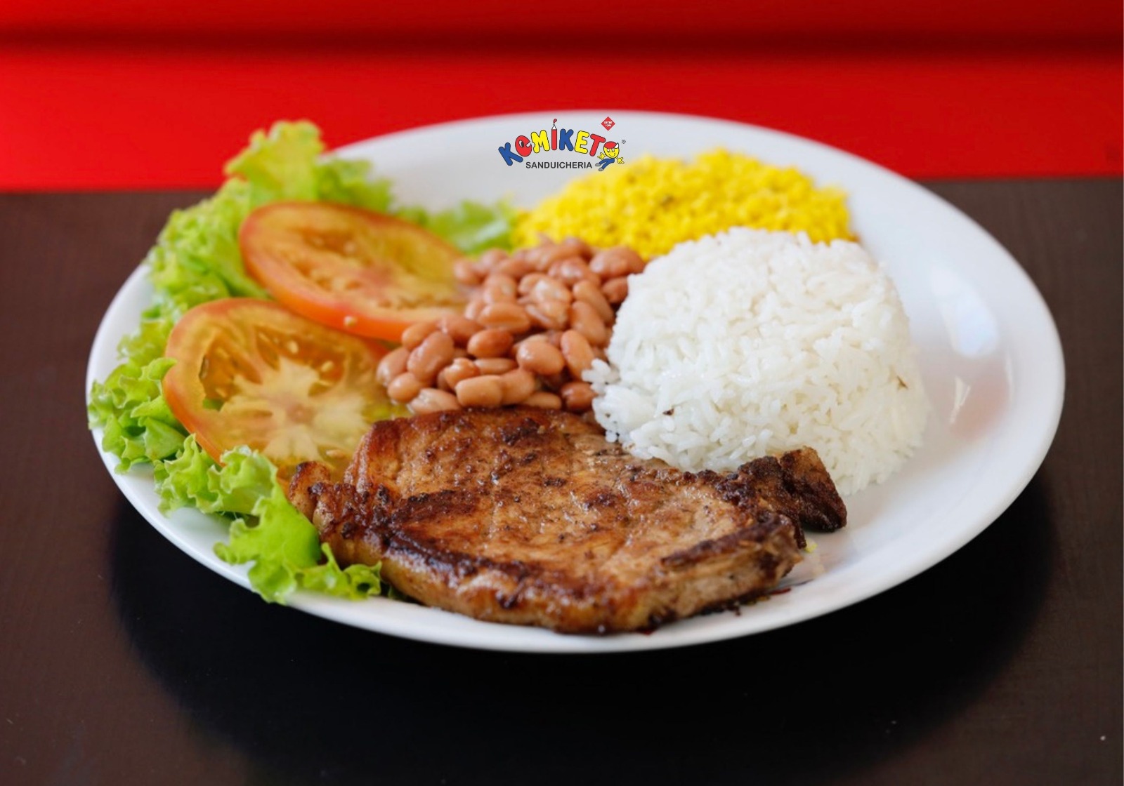 ARROZ, BISTECA SUÍNA, ALFACE, TOMATE, FEIJÃO DE CALDO E FAROFA