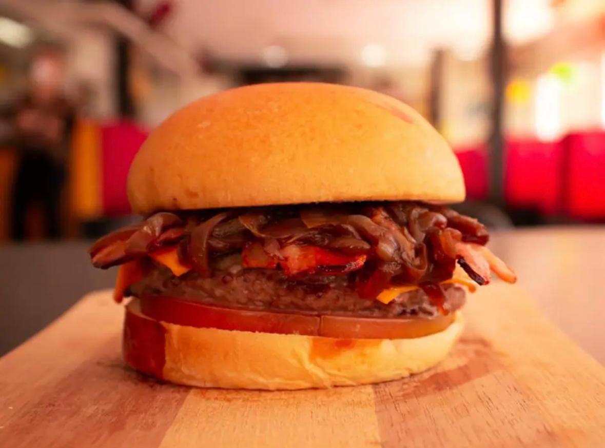 PÃO BRIOCHE, HAMB. DE 180gr, FATIA DE CHEDDAR, BACON, CEBOLA CARAMELIZADA E TOMATE