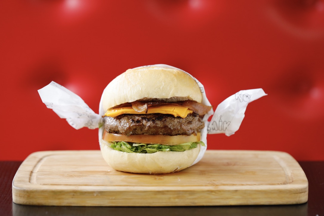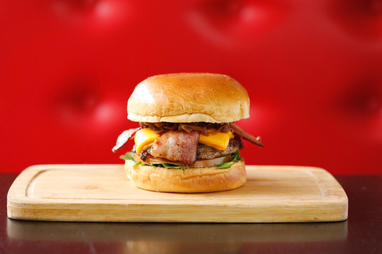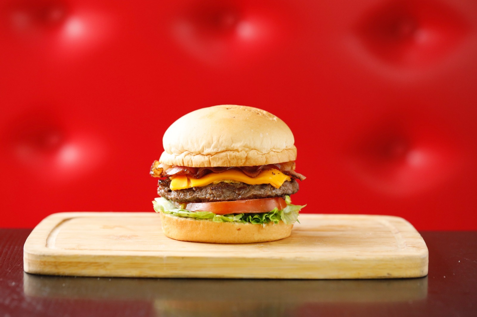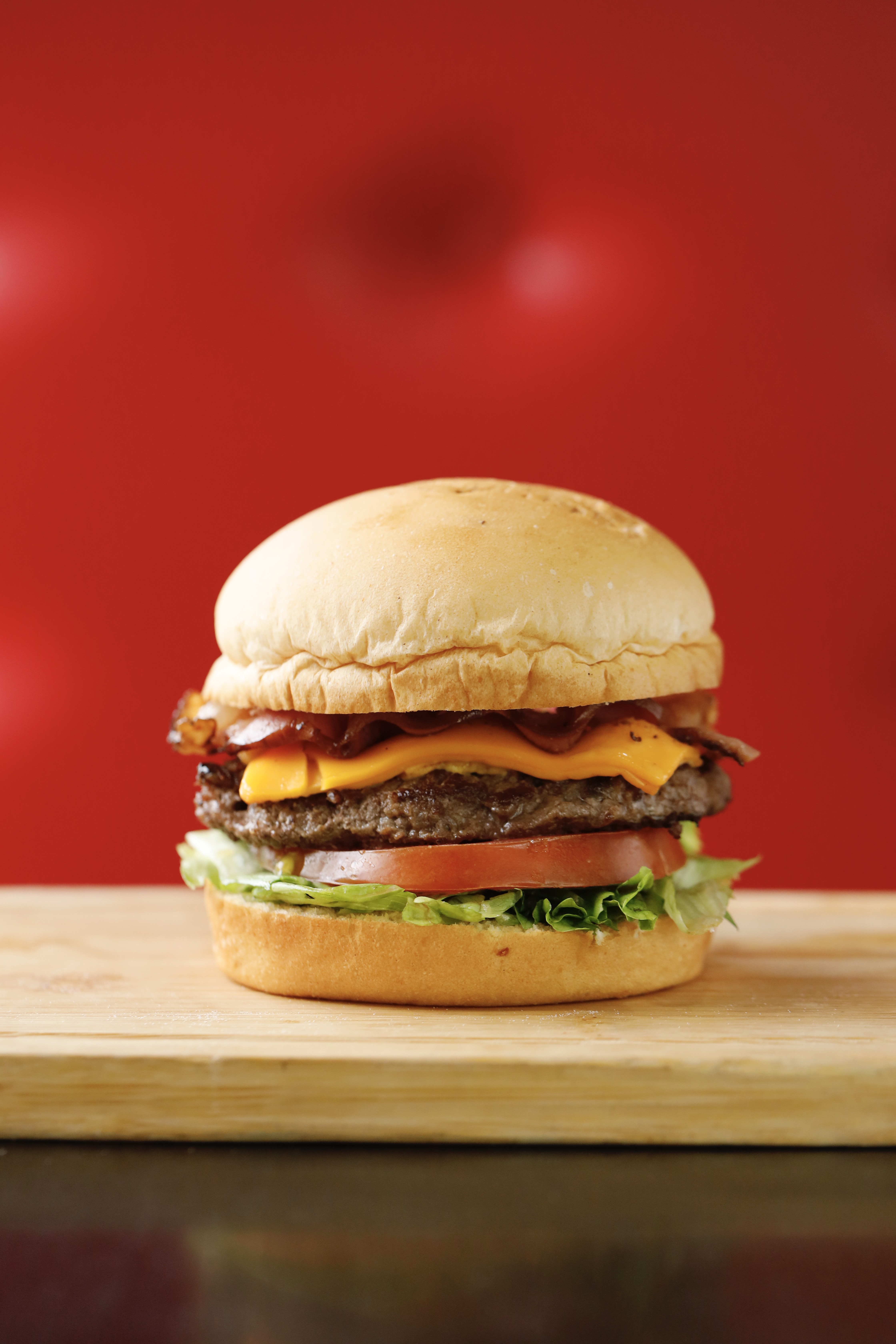 PÃO HAMB 60gr, HAMBÚRGUER BOVINO 70gr, FATIA DE CHEDDAR, BACON, TOMATE E ALFACE