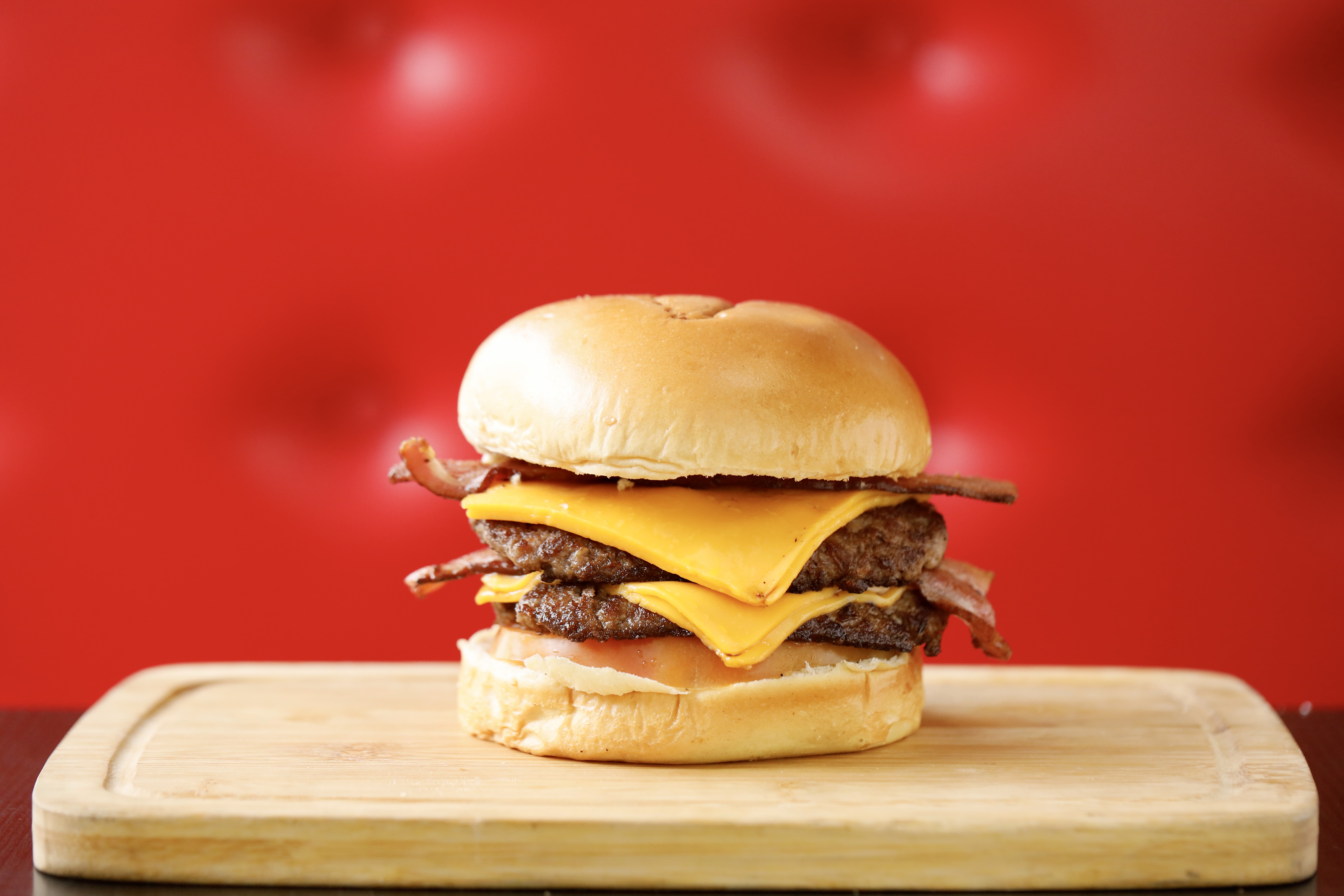 PÃO HAMB. 60gr, 2 HAMB. BOVINO 70gr, 2 FATIAS DE CHEDDAR, BACON, TOMATE E ALFACE