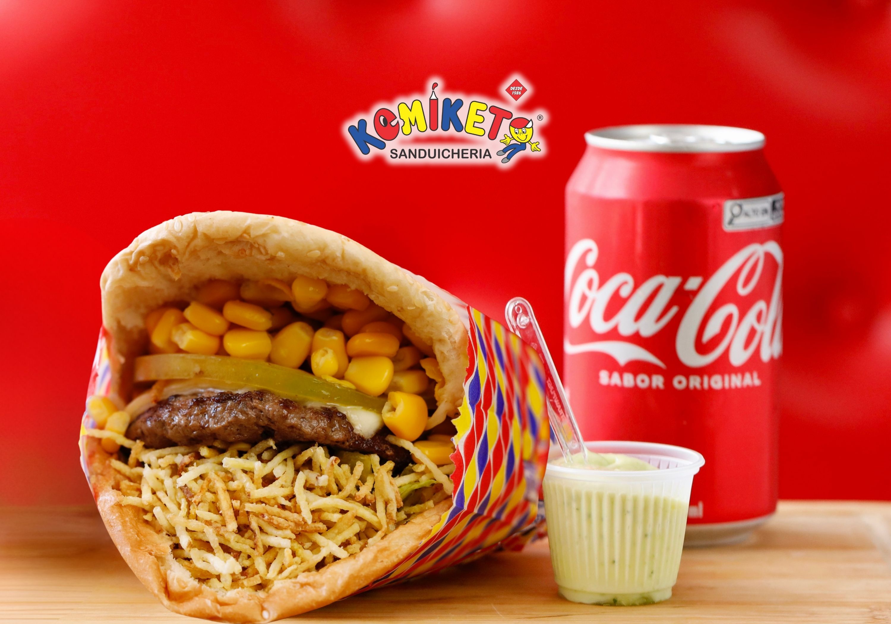 PÃO, HAMBURGUER, MUSSARELA, TOMATE, ALFACE, COCA COLA E MAIONESE KOMIKETO
