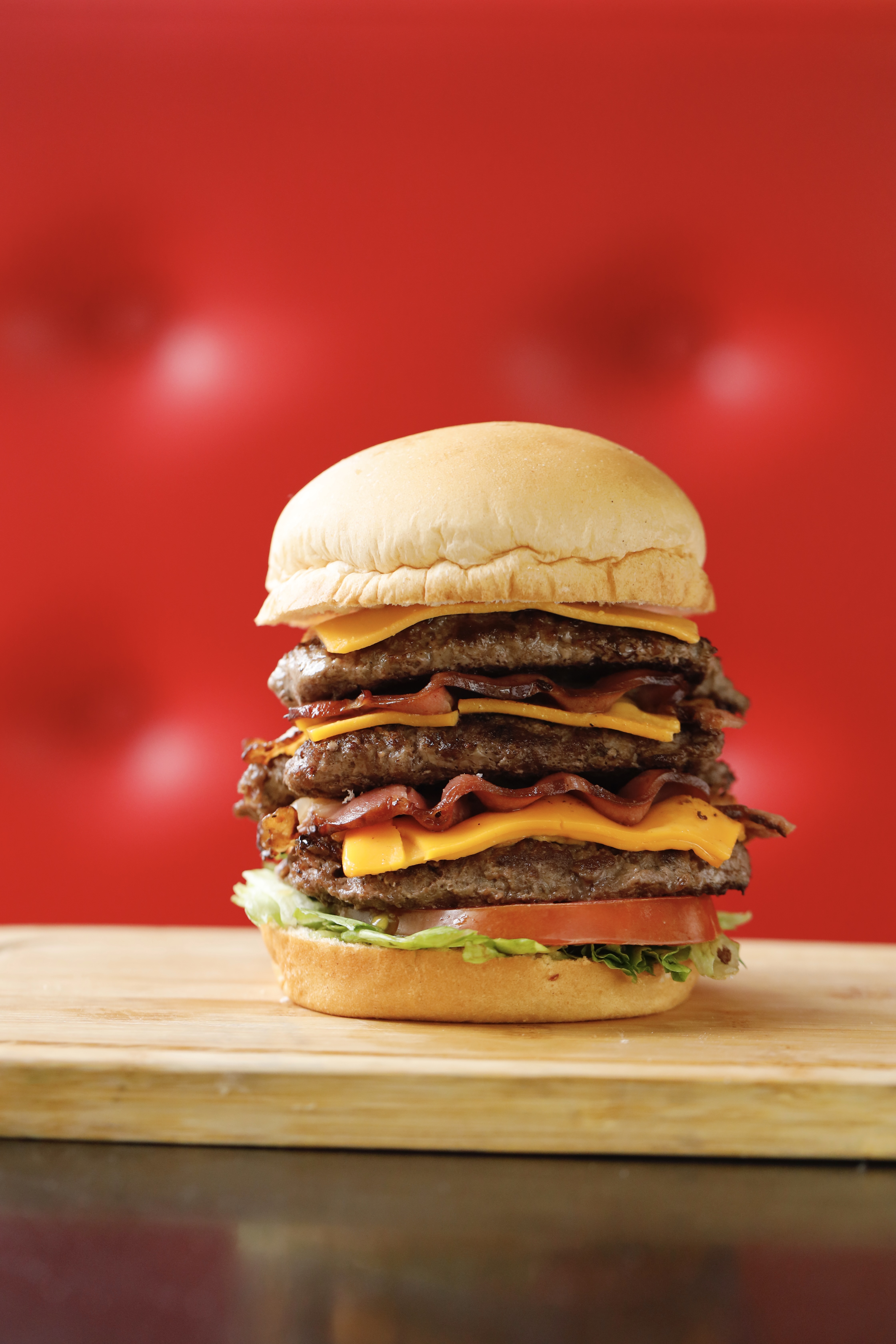 PÃO HAMB 60gr, 3 HAMBURGUERES BOVINO 70gr, 3 FATIAS DE CHEDDAR, BACON, TOMATE E ALFACE