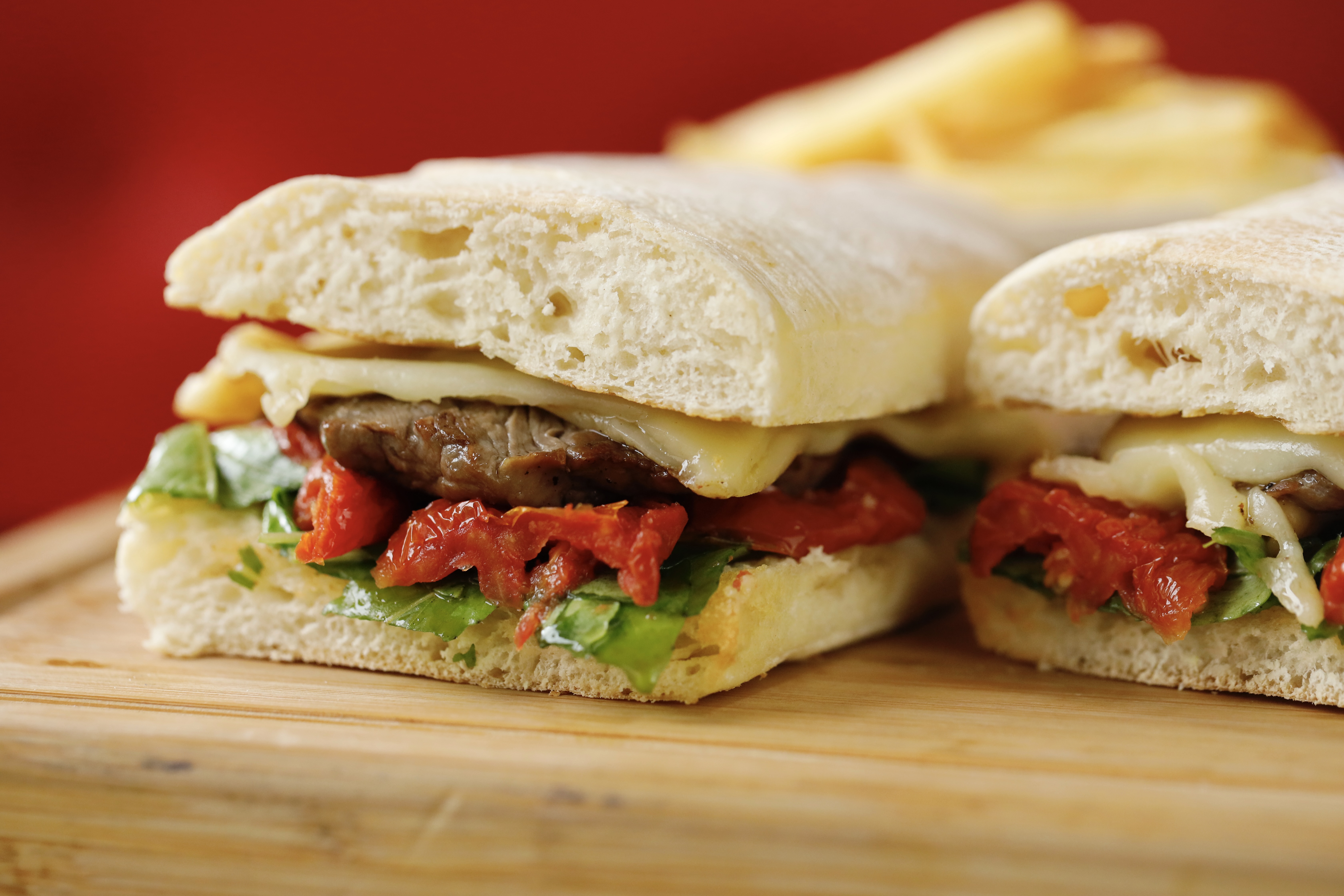 PÃO CIABATA, FILÉ MIGNON, 3 FATIAS DE MUSSARELA, TOMATE SECO E RÚCULA