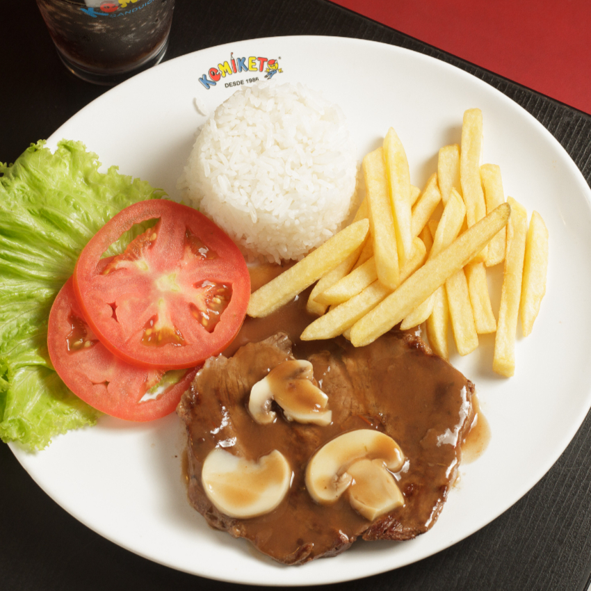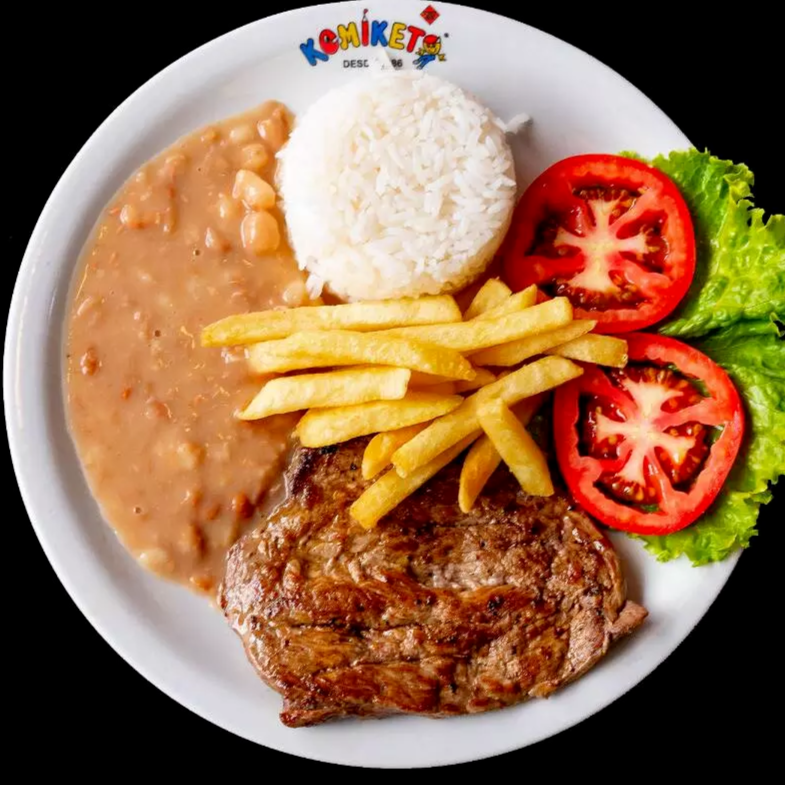 ARROZ, STEAK, MUSSARELA, MOLHO DE TOMATE DA CASA E BATATA FRITA