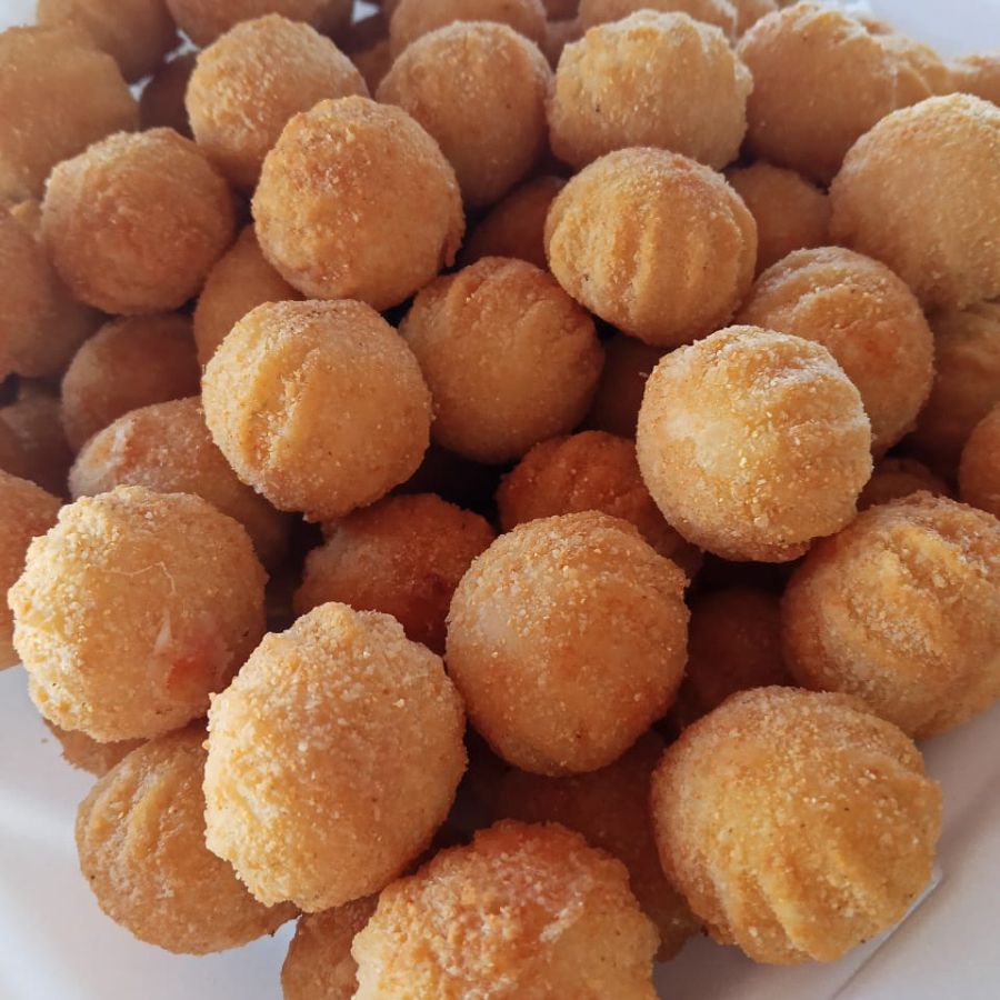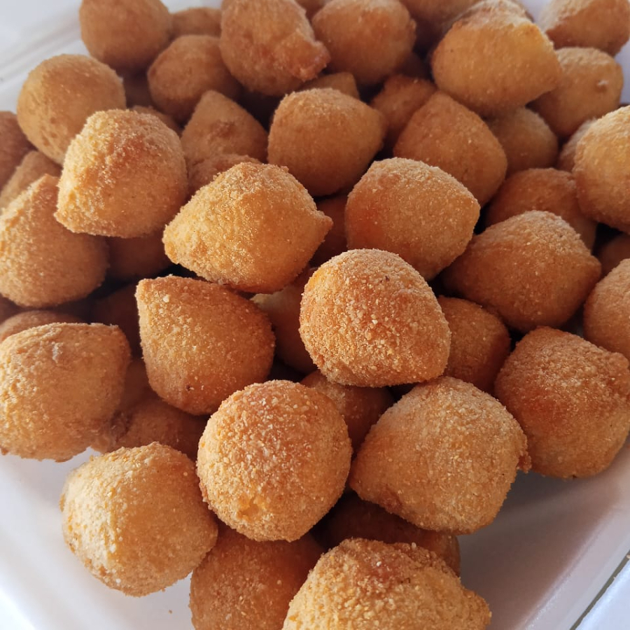 25 bolinhas de presunto e queijo de 15g, feitos com presunto, muçarela e requeijão para dar mais cremosidade