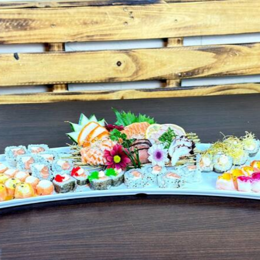 30 sushis variados,10 sashimis de slamão,10 sashimis de tilapia,4 niguiris variados,5gunkans de salmão,5 gunkans de tilapia,20 hot,3 bolinhos de peixe,3pasteizinhos de carne,5 rolinhos doces,10 peixe empanados