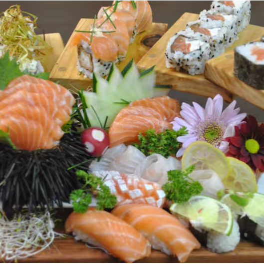 10 sashimis de salmão, 10 sashimis de tilapia, 5 gulkans de salmão, 5 gulkans de tilapia, 25sushis, 2 nuiguiris de salmão
