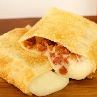 Pastel com massa leve e crocante, recheado com bacon e queijo derretido.