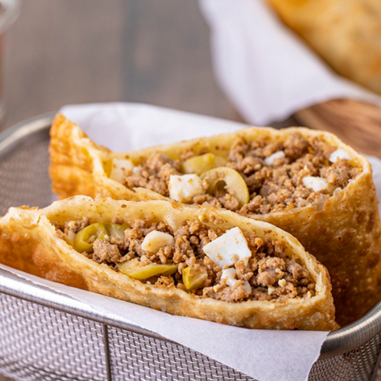 Pastel com massa leve e crocante, recheado com carne moída bem temperada.