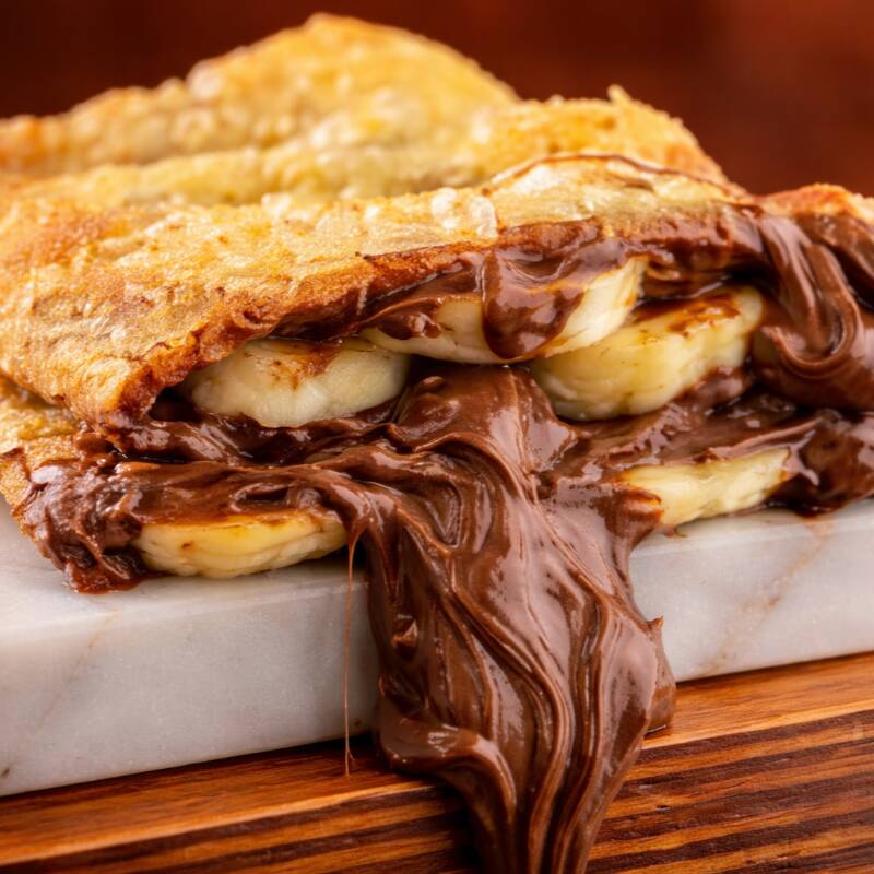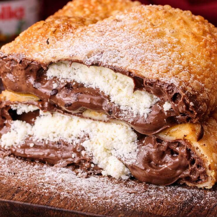 Pastel com massa dourada e crocante, recheado com queijo derretido, Nutella cremosa e banana.