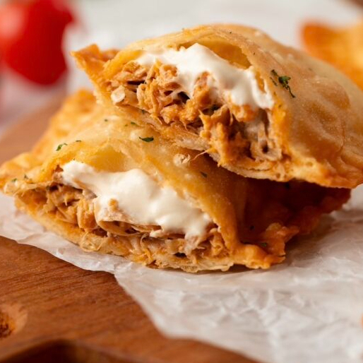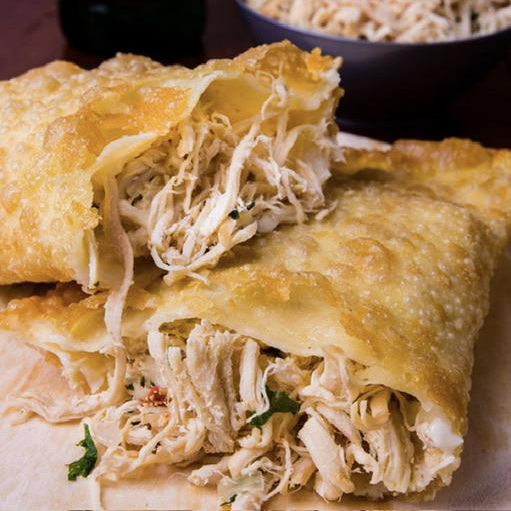 Pastel com massa leve e crocante, recheado com frango desfiado e queijo derretido e cremoso.