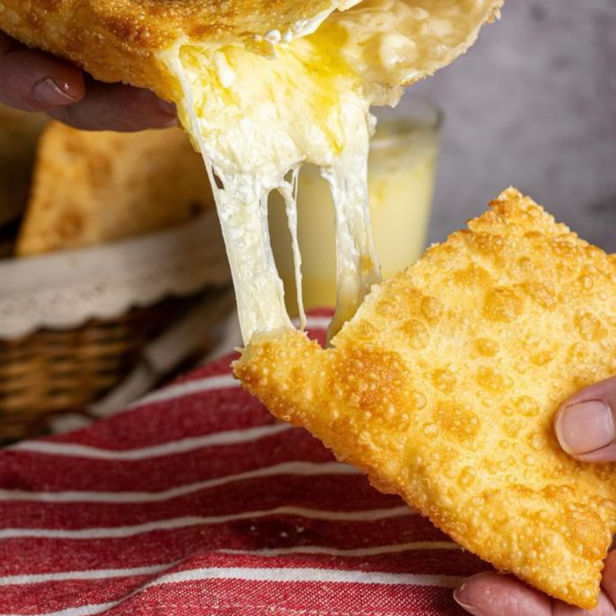 Pastel de queijo, com massa leve e crocante, recheado com queijo derretido e cremoso.