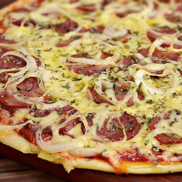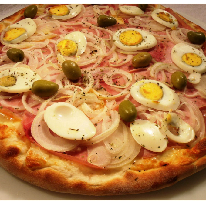 Molho de Tomate, Mussarela, Presunto, Cebola, Ovo e Orégano