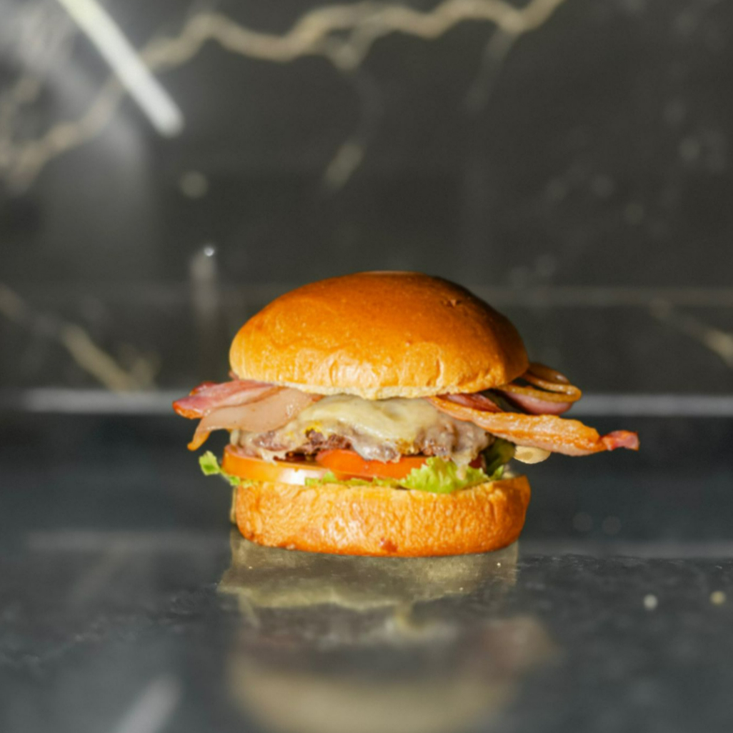 Pão, blend especial 75g, queijo mussarela, 2x bacon, alface americana, tomate e molhos
