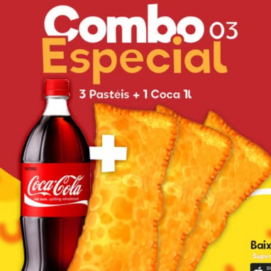 3 pastéis carne moída e queijo mussarela 1 coca-cola 1lt
