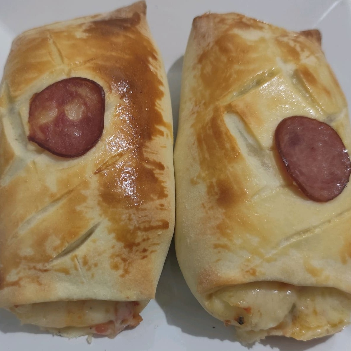 Salsicha com queijo e molho de tomate num salgado assado macio e bem recheado. Lanche prático e gostoso!