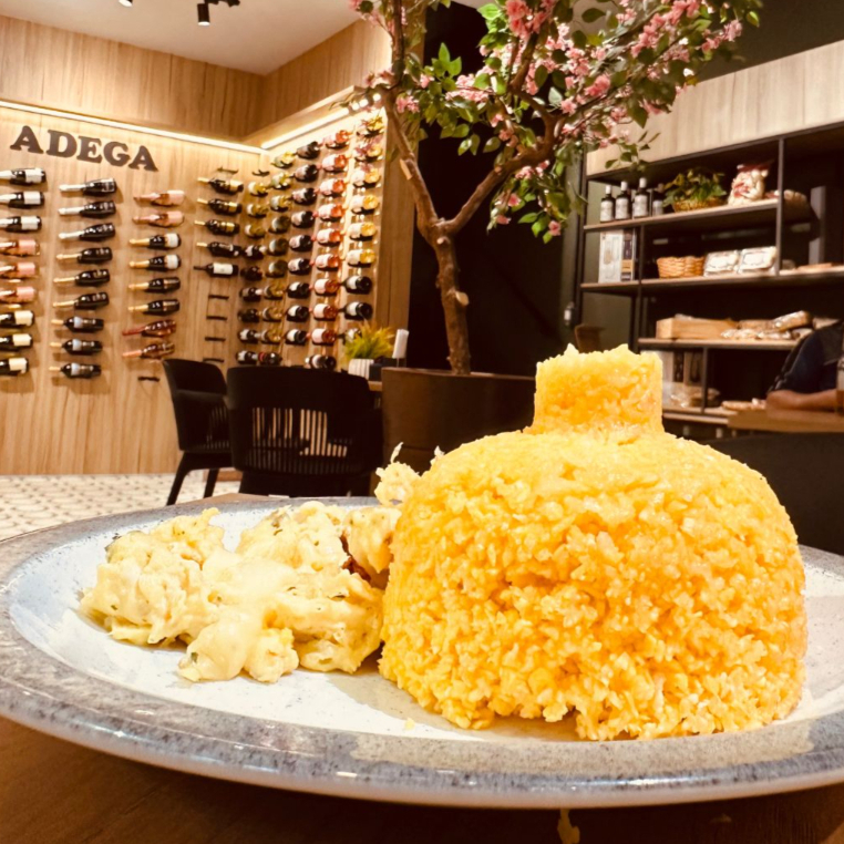 Prato preparado com Cuscuz na manteiga, ovos mexidos e mussarela