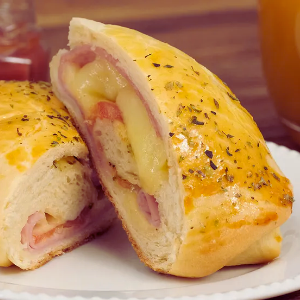 Massa quebradiça recheada com mussarela, requeijão cremoso, manjericão e tomate.