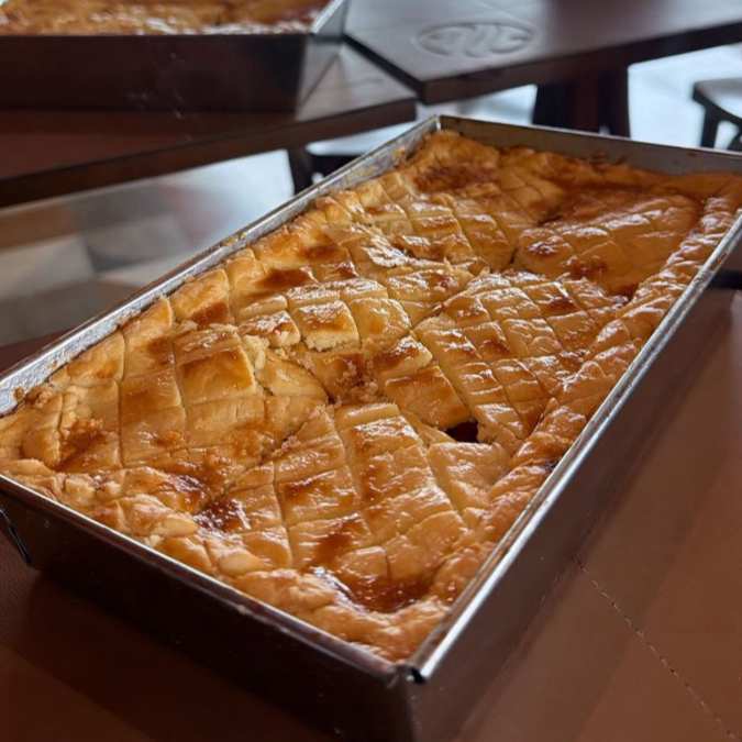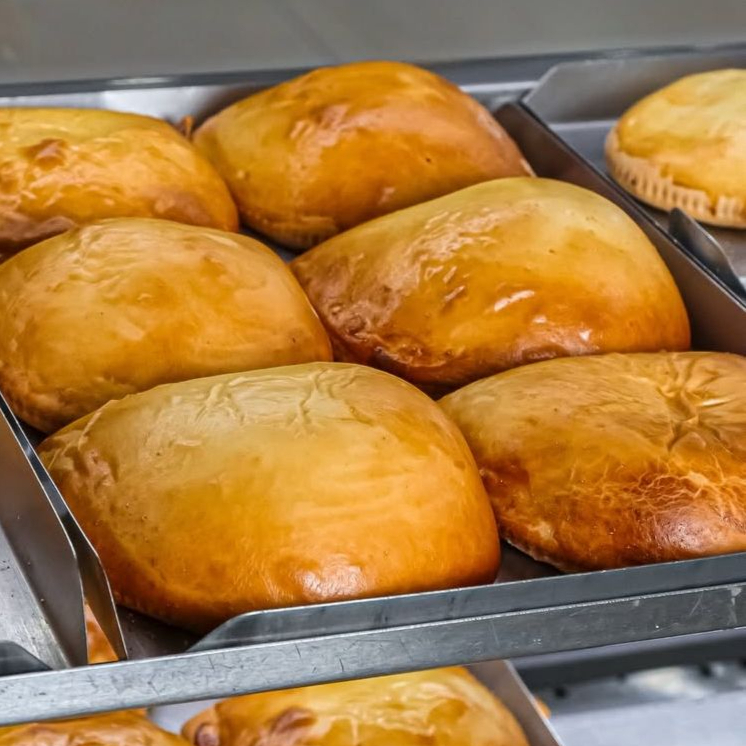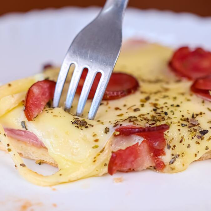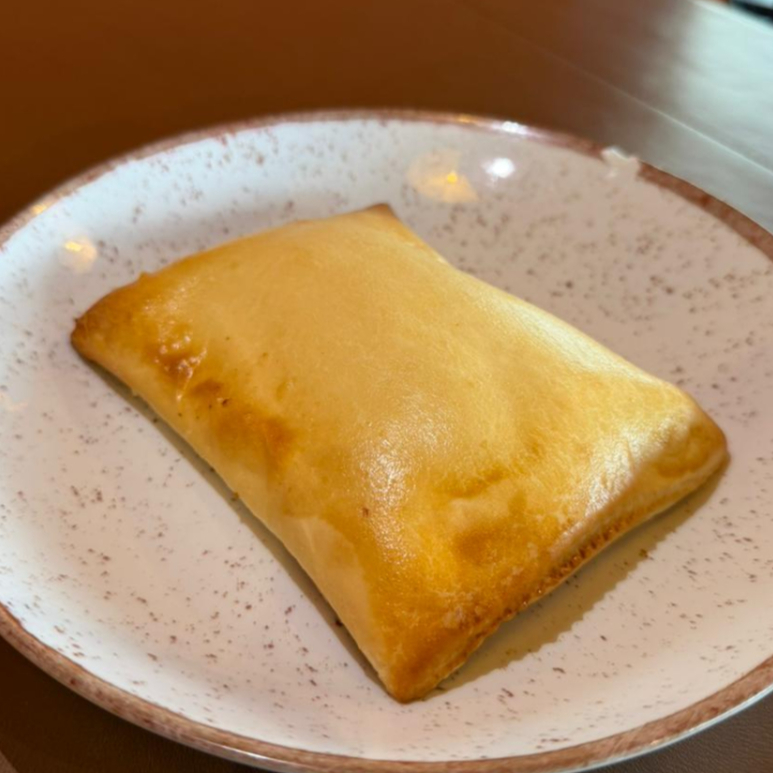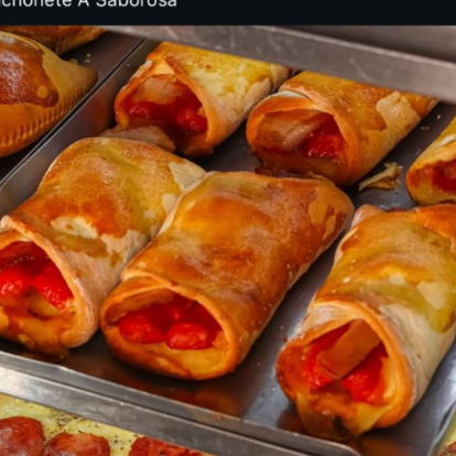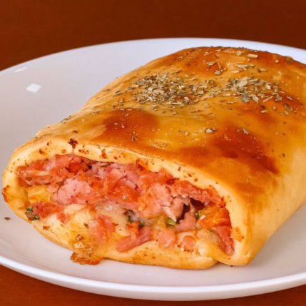 Salgado assado com presunto, mussarela, azeitona, tomate e orégano.