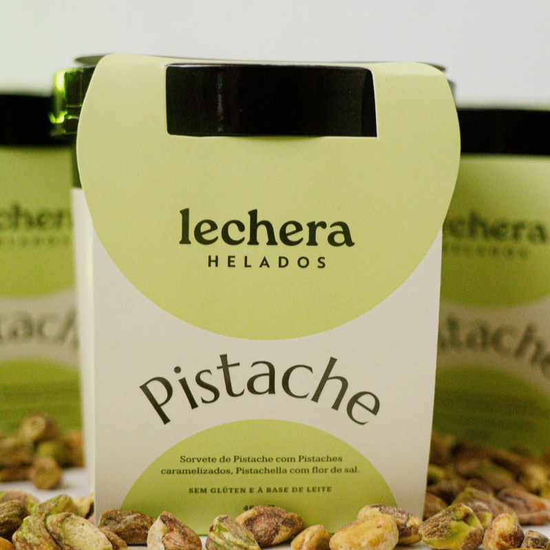 Sorvete de pistache mesclado com pistache caramelizado e uma ganache de pistache com chocolate branco com flor de sal.