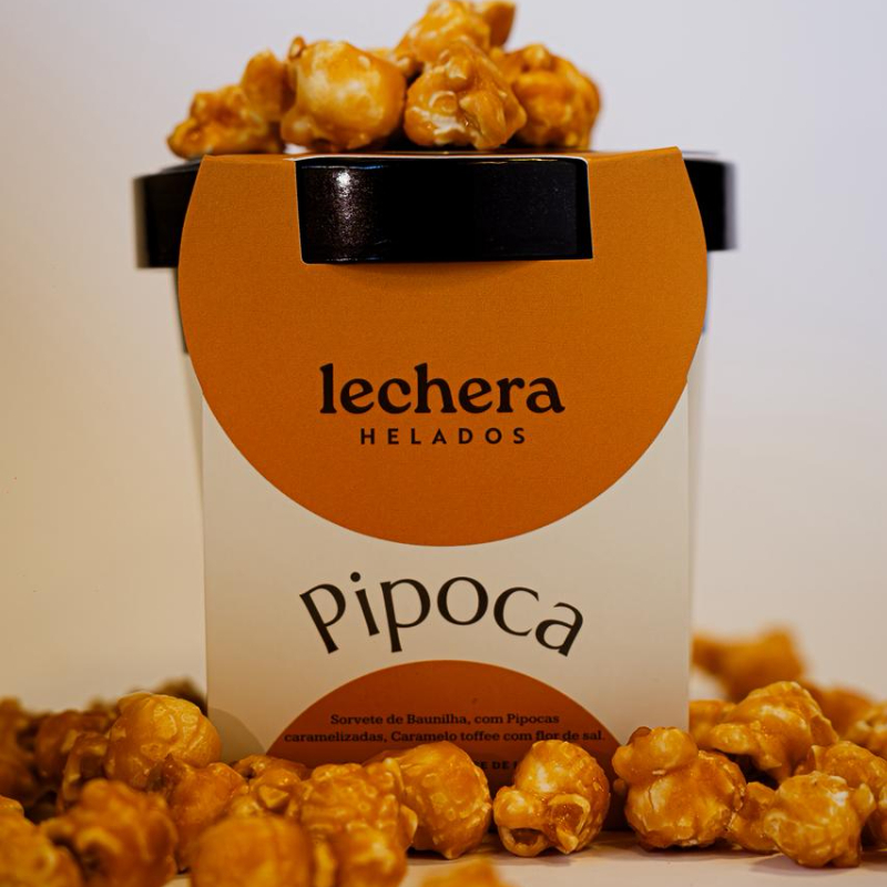 Sorvete de baunilha com pipocas caramelizadas feitas na casa, caramelo com flor de sal