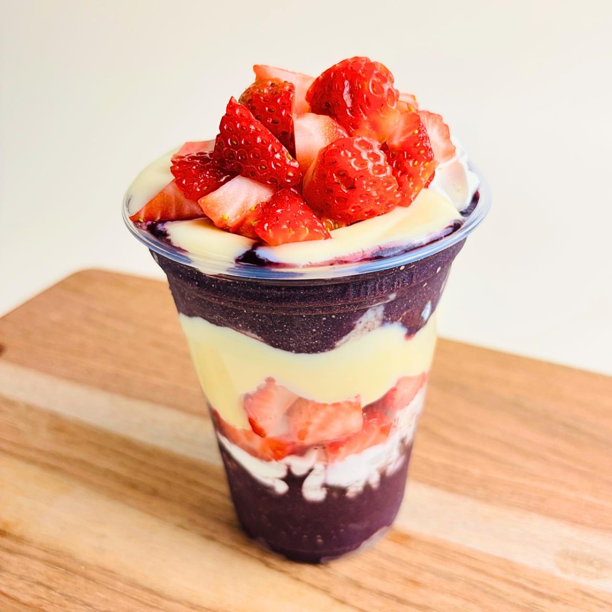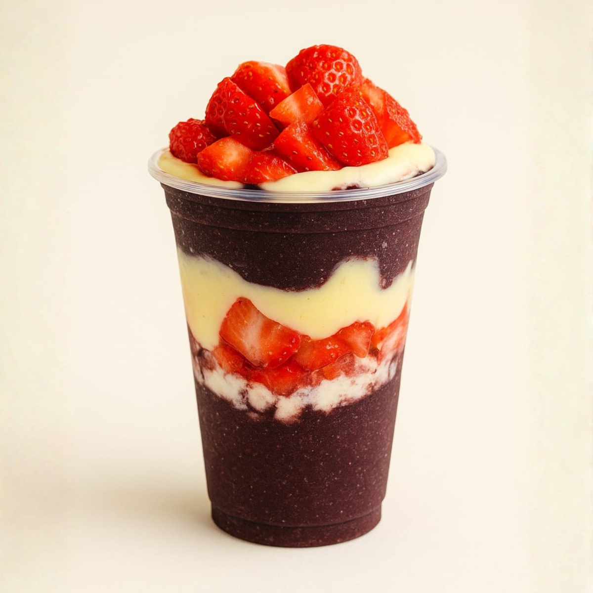 Doce leve e nostálgico, que aquece o coração. Açaí intenso acompanhado de Brigadeiro Branco artesanal, Chantininho, Leite em pó e muito Morango.