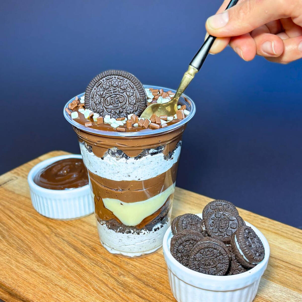 Um copo recheado com camadas de mousse de Oreo, brigadeiro ao leite cremoso e pedaços de brownie suculento. Finalizado com granulado de chocolate e Oreo.