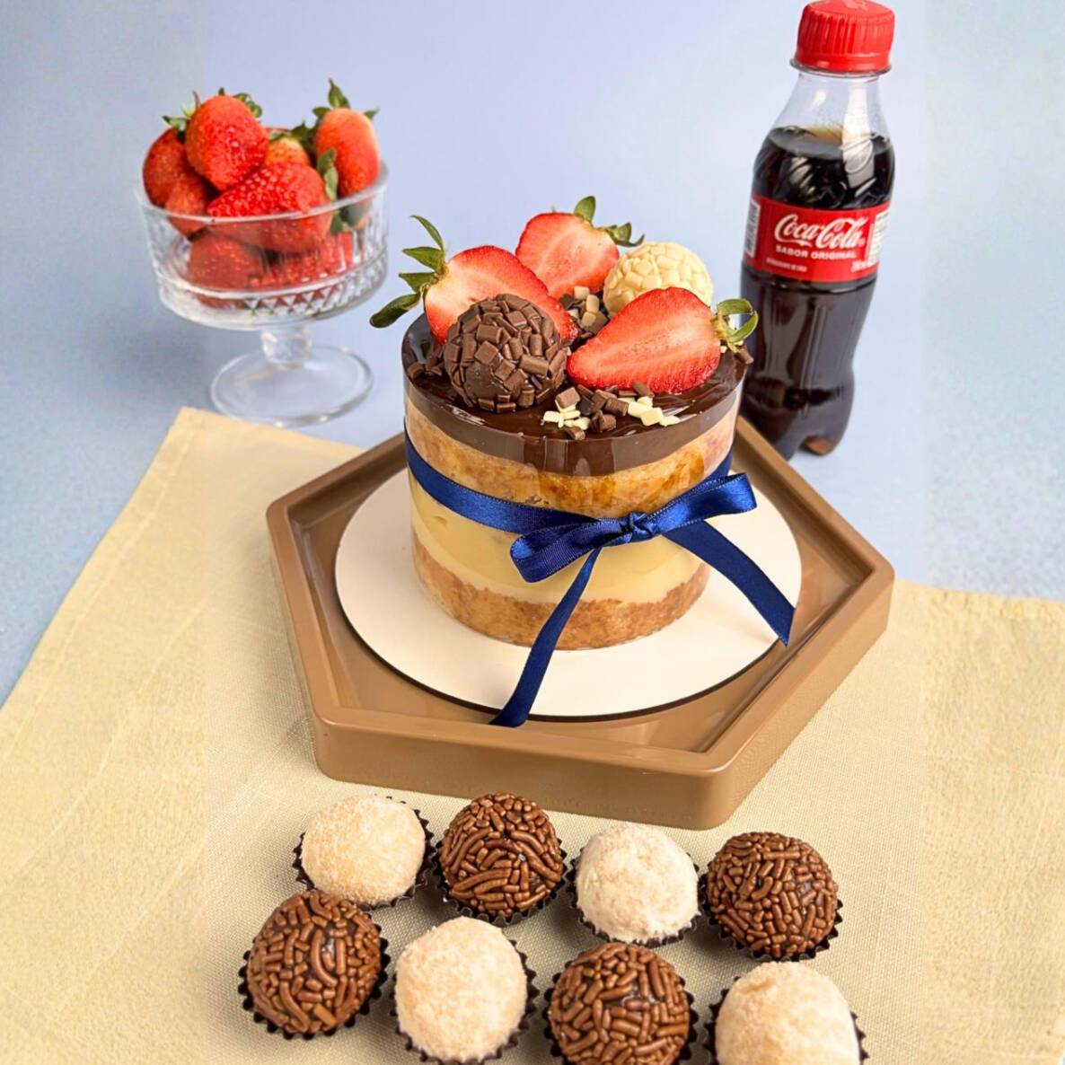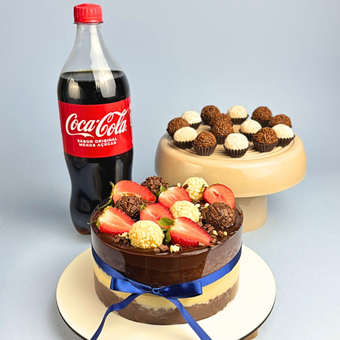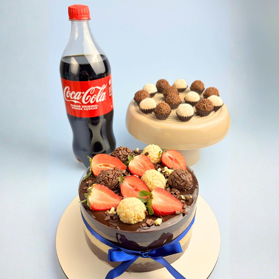 ATENÇÃO PARA DESCRIÇÃO DE PESO E PORÇÕES QUE SERVE!!! Bolo de aprox. 500g, 8 docinhos (ninho e brigadeiro ao leite) e 1 coca cola de 1 litro. Massa branca fofinha, recheio de brigadeiro branco e cobertura de brigadeiro ao leite — o clássico Dois Amores que agrada todo mundo. Serve até 3 pessoas. ***Bolo estilo Naked Cake, finalizado com uma faixa de acetato na lateral, que deve ser retirada na hora do consumo. Retirar a faixa com o bolo gelado.