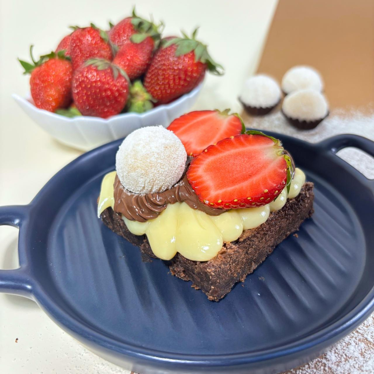 Brownie artesanal macio, molhadinho e feito com chocolate de alta qualidade. Coberto com brigadeiro de Ninho, Nutella e morango. Serve 1 pessoa