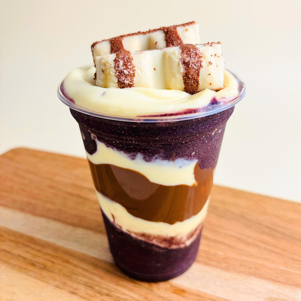 Doce intenso e marcante. Camadas de Açaí acompanhado de Brigadeiro Branco artesanal, Nutella e finalizado com Kinder Bueno.
