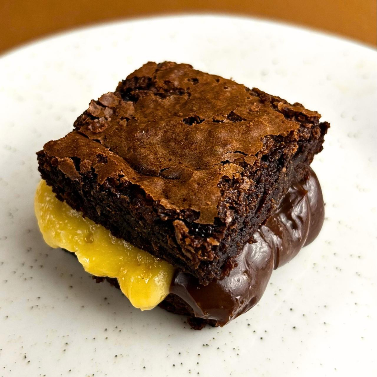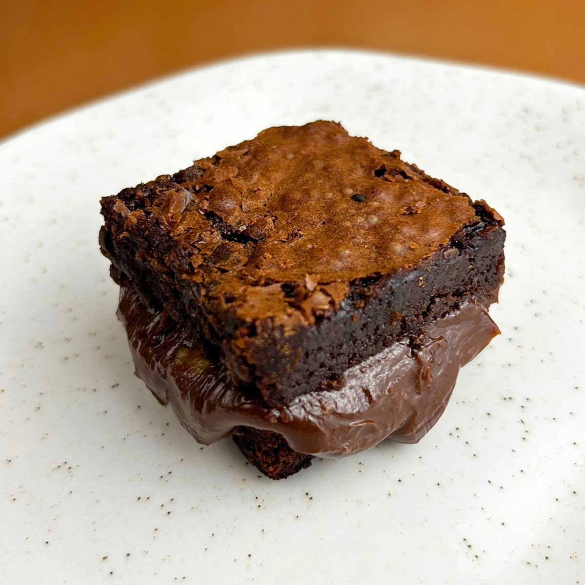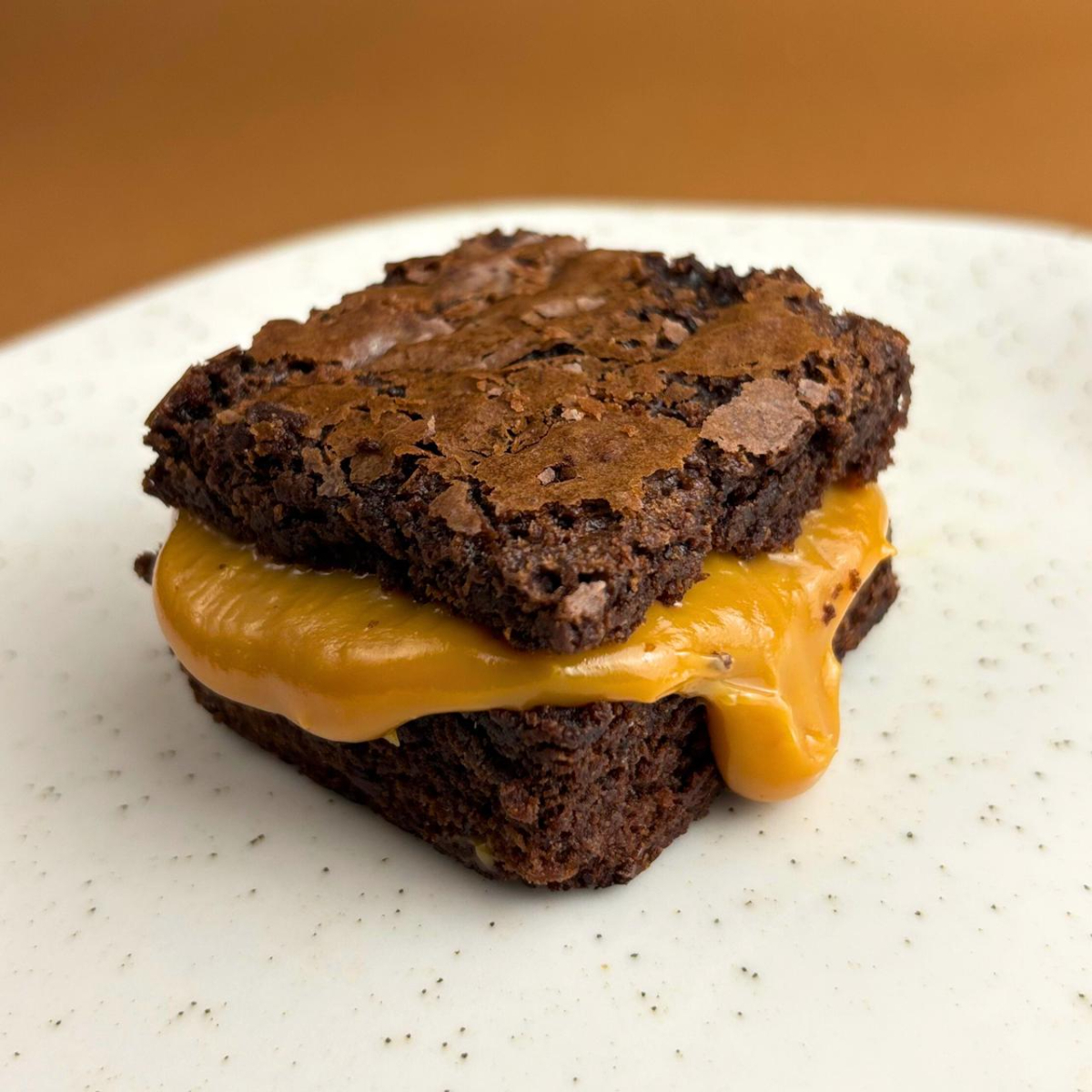 Brownie artesanal macio, molhadinho e feito com chocolate de alta qualidade. Recheado com doce de leite caseiro. Serve 1 pessoa
