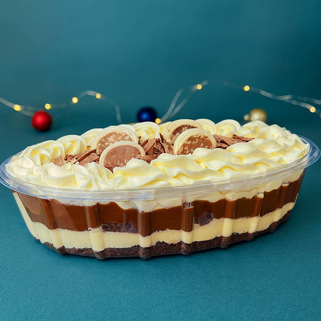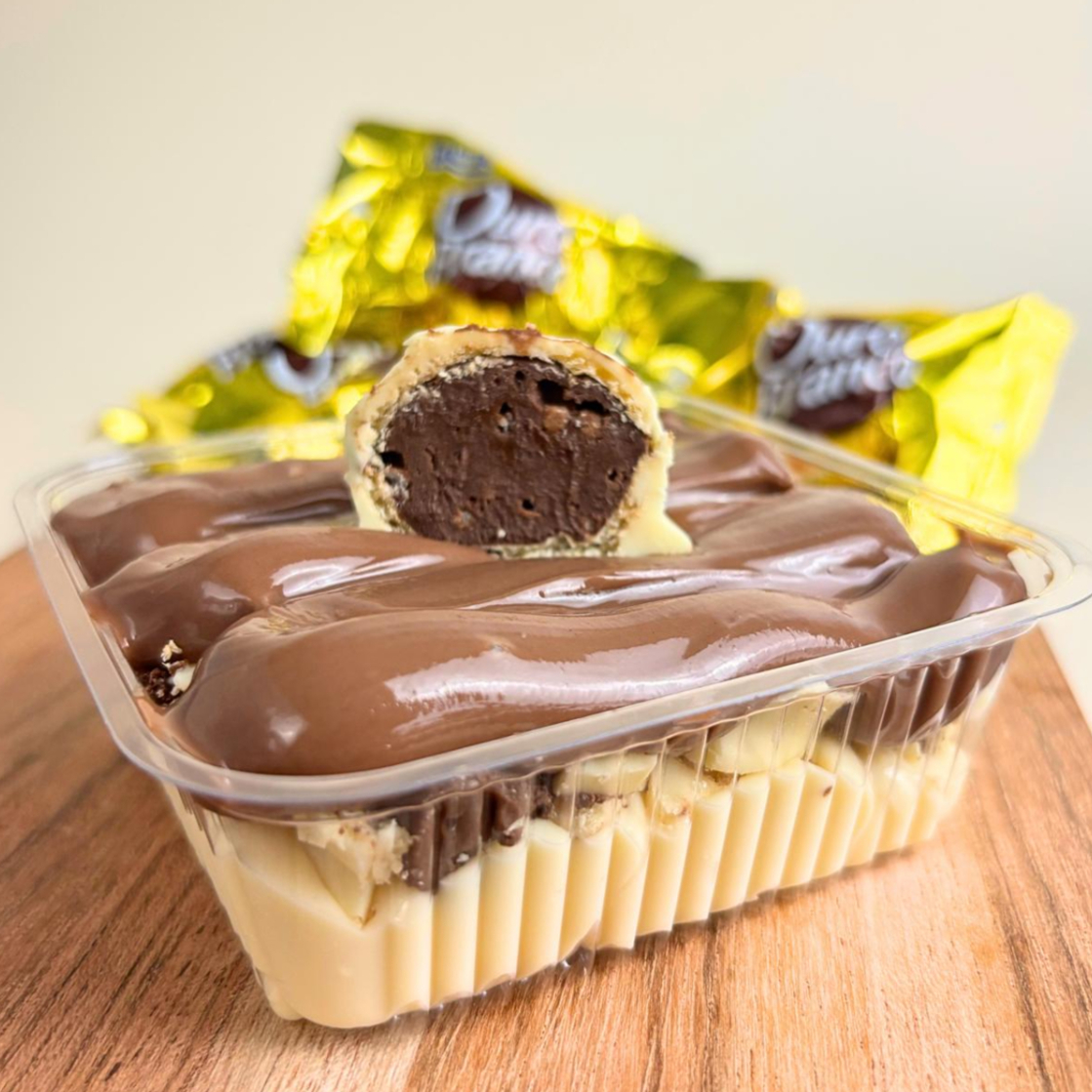 Camadas cremosas de puro prazer! Creme branco sedoso, generosos pedaços de bombom ouro branco, finalizado com nosso brigadeiro ao leite e mais bombom.