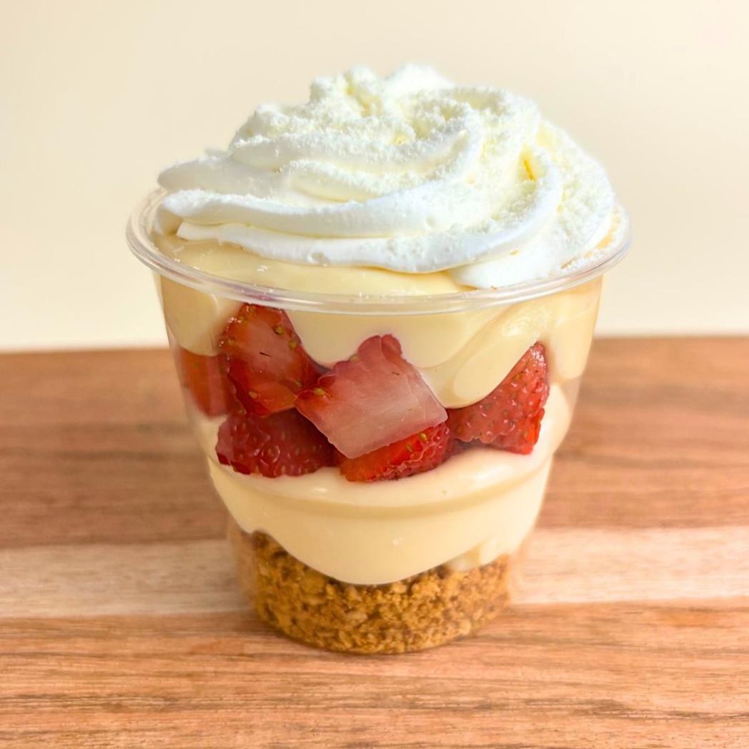 Farofinha amanteigada de biscoito crocante, com camadas de creme de brigadeiro branco com morangos frescos no meio. Finalizada com chantininho. Serve 1 pessoa.