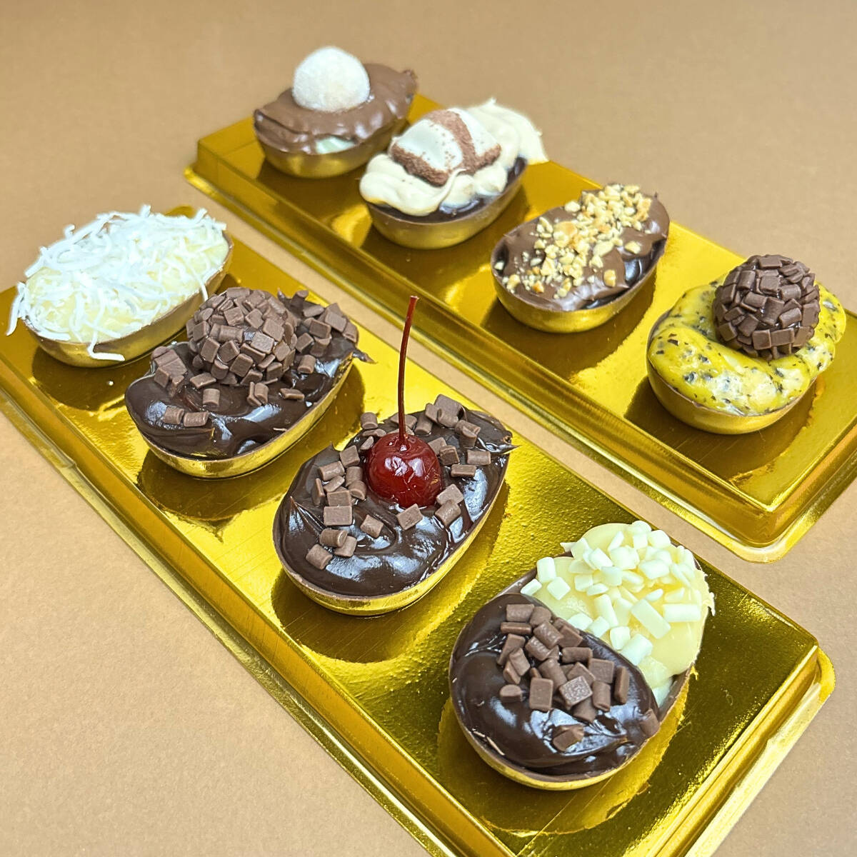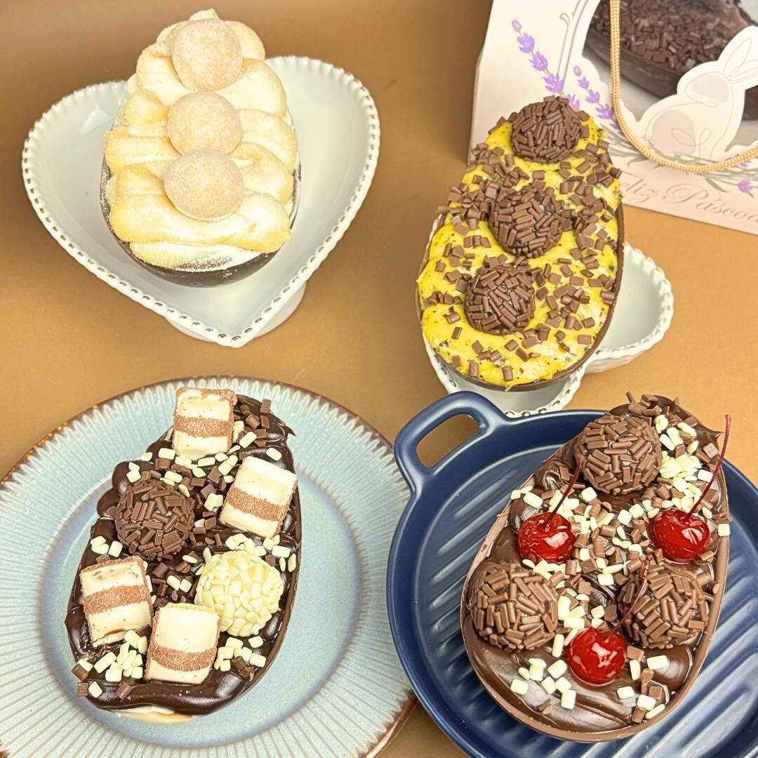 4 Mini ovos de 50 gramas feitos com casca de chocolate nobre e recheios super cremosos e saborosos, preparados com o mesmo padrão artesanal dos nossos produtos. Os sabores são os mesmos que estarão disponíveis nos ovos de Páscoa maiores, perfeitos para experimentar antes e escolher seu favorito. Ideal para provar, presentear ou se deliciar com um gostinho da nossa Páscoa!