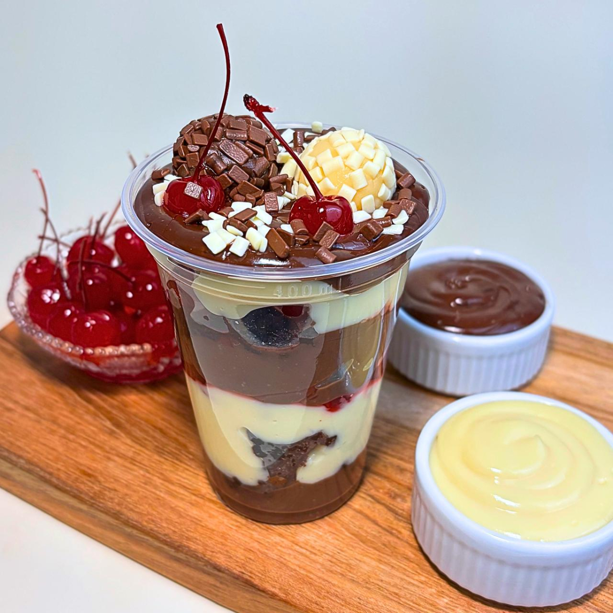 Um copo recheado com camadas de brigadeiro cremoso branco e ao leite, pedaços de brownie suculento e cereja. Finalizado com granulado de chocolate, docinho e cereja. Obs.: Foto correspondente ao copo de 500g, em copos menores, a montagem pode variar!