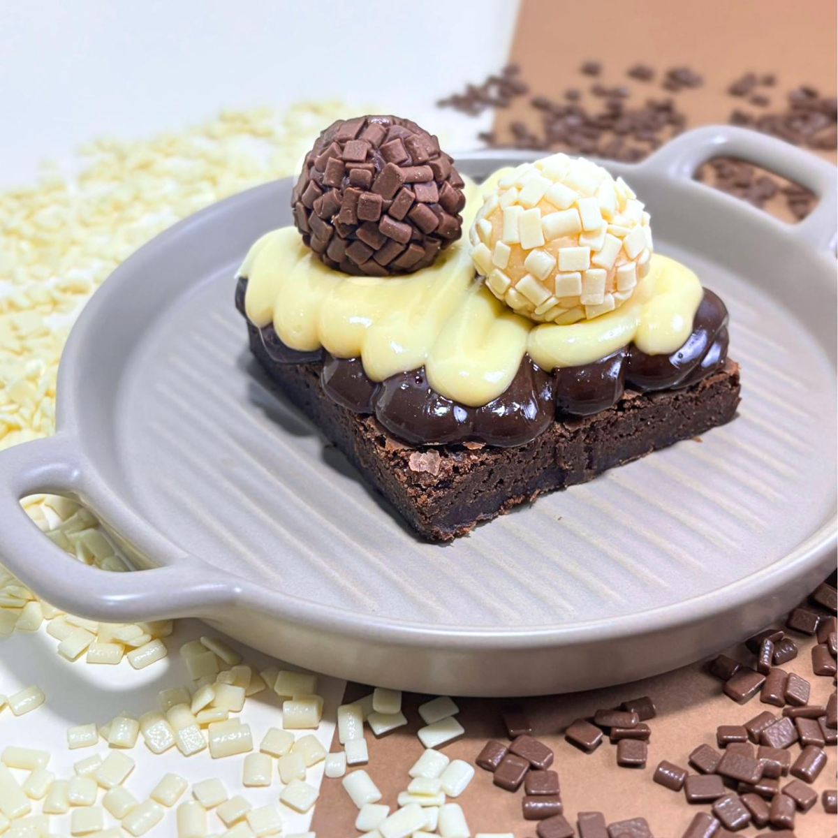 Brownie artesanal macio, molhadinho e feito com chocolate de alta qualidade. Coberto com brigadeiro ao leite e brigadeiro branco. Serve 1 pessoa