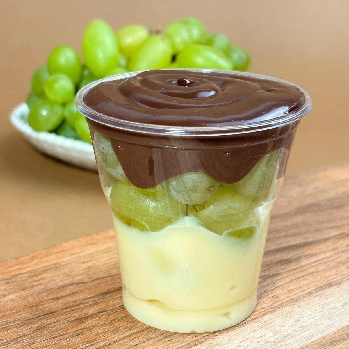 Camadas de creme de brigadeiro branco e preto com uvas frescas no meio. A combinação perfeita de sabores! Serve 1 pessoa.