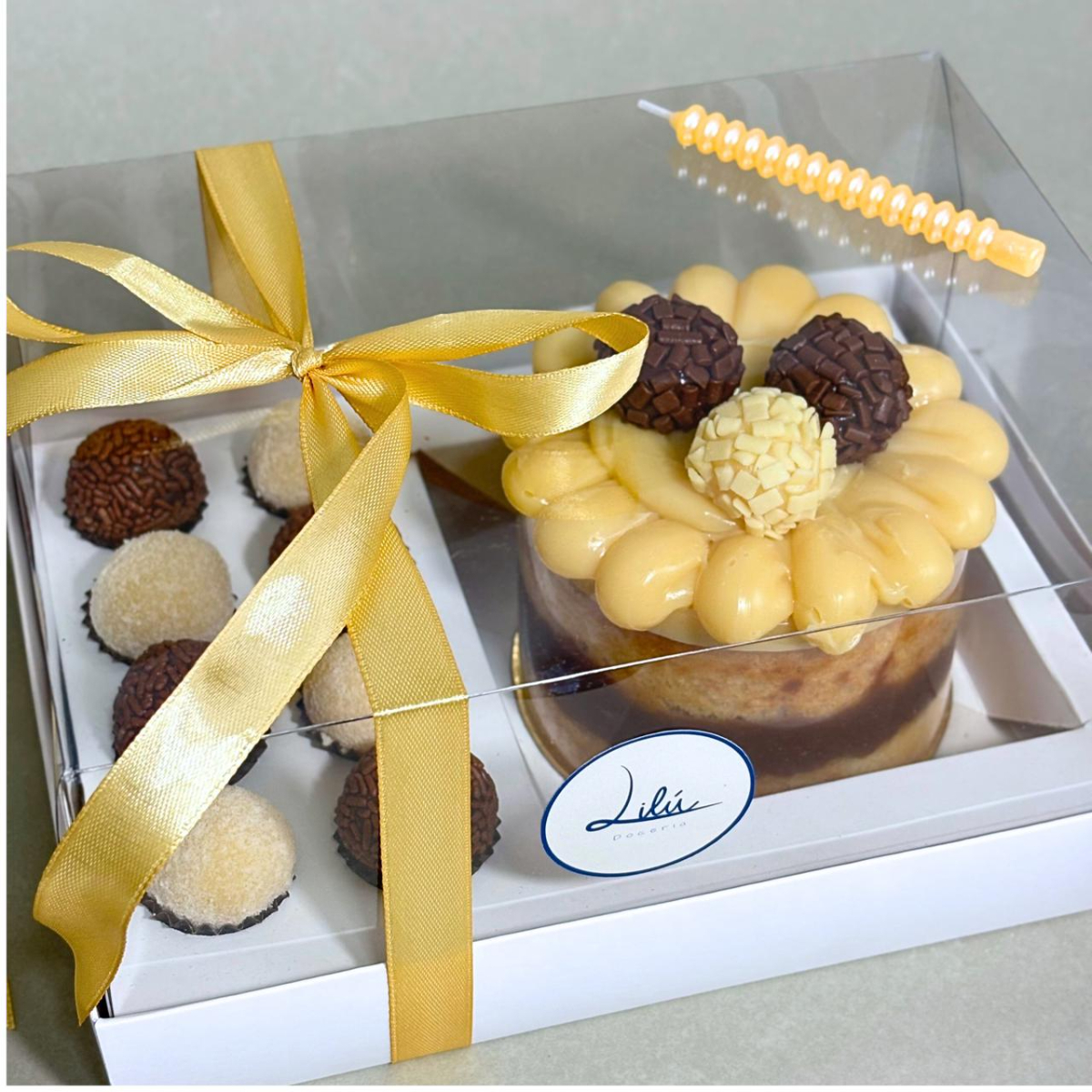 Porque às vezes um gesto doce fala mais do que mil palavras… Nosso Box Lembrei de Você une o carinho do Bolo Mimo (600g) com a delicadeza de 8 docinhos, criando o presente perfeito para surpreender, encantar e adoçar o dia de quem você ama. Serve até 3 pessoas. Obs: acompanha 1 vela, caixa (foto) e sacola presenteável.