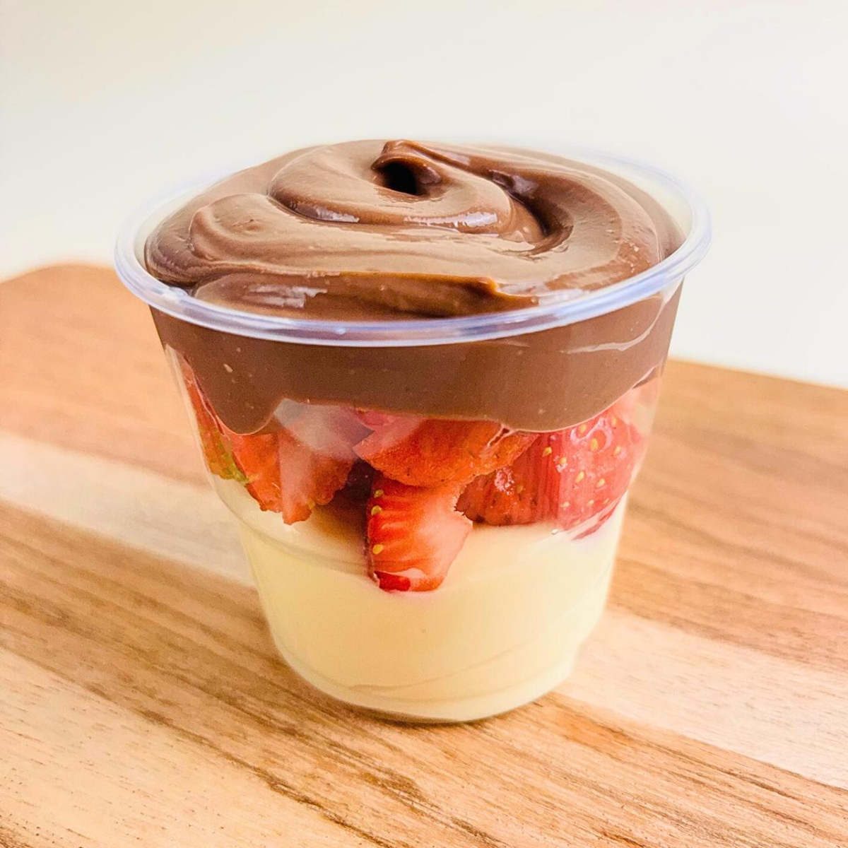 Camadas de creme de brigadeiro branco e preto com morangos frescos no meio. A combinação perfeita de sabores! Serve 1 pessoa.