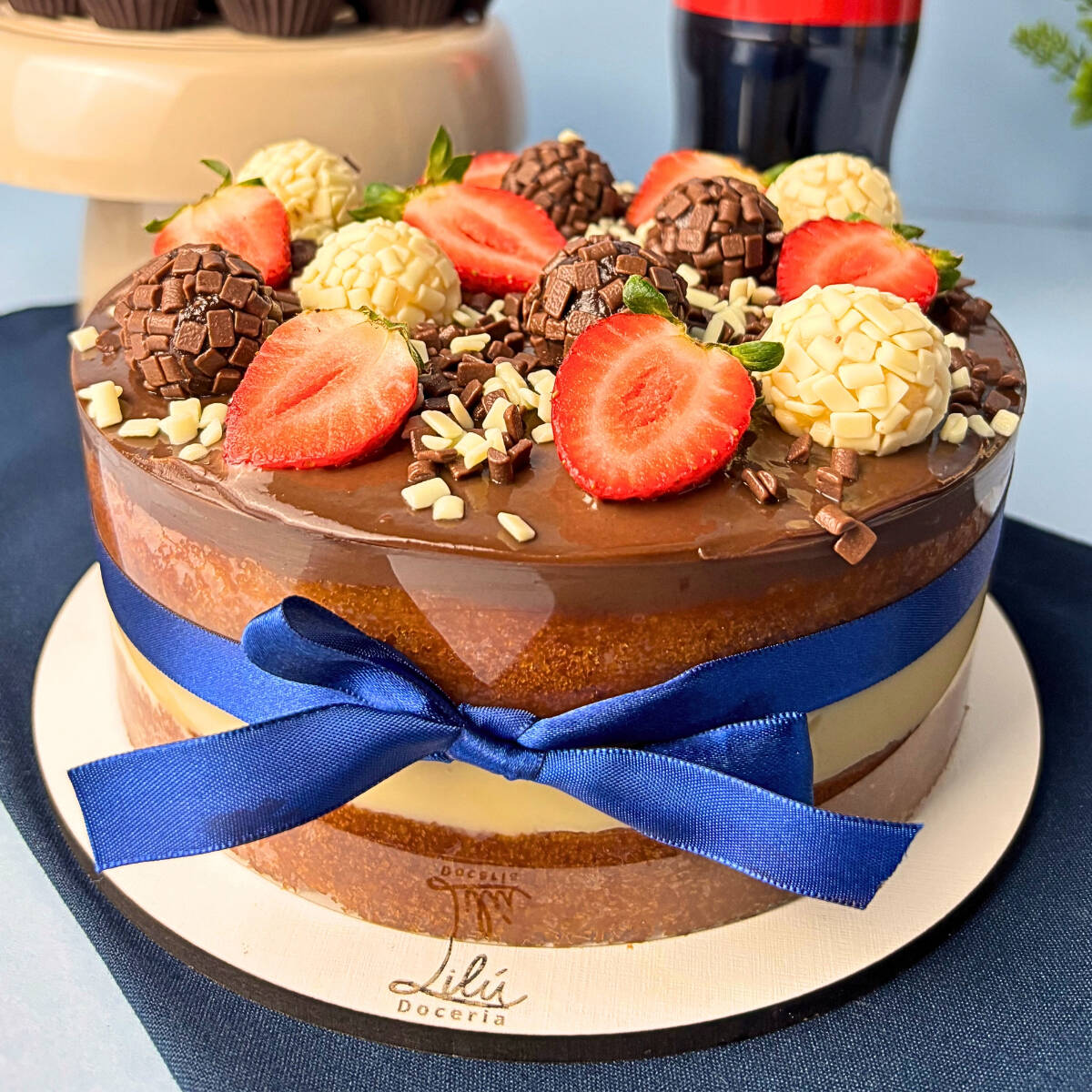 ATENÇÃO PARA DESCRIÇÃO DE PESO E PORÇÕES QUE SERVE!!! Bolo de aprox. 1 kg, 20 docinhos (ninho e brigadeiro ao leite) e 1 coca cola de 2 litros. Massa branca fofinha, recheio de brigadeiro branco e cobertura de brigadeiro ao leite — o clássico Dois Amores que agrada todo mundo. Serve até 8 porções. ***Bolo estilo Naked Cake, finalizado com uma faixa de acetato na lateral, que deve ser retirada na hora do consumo. Retirar a faixa com o bolo gelado.