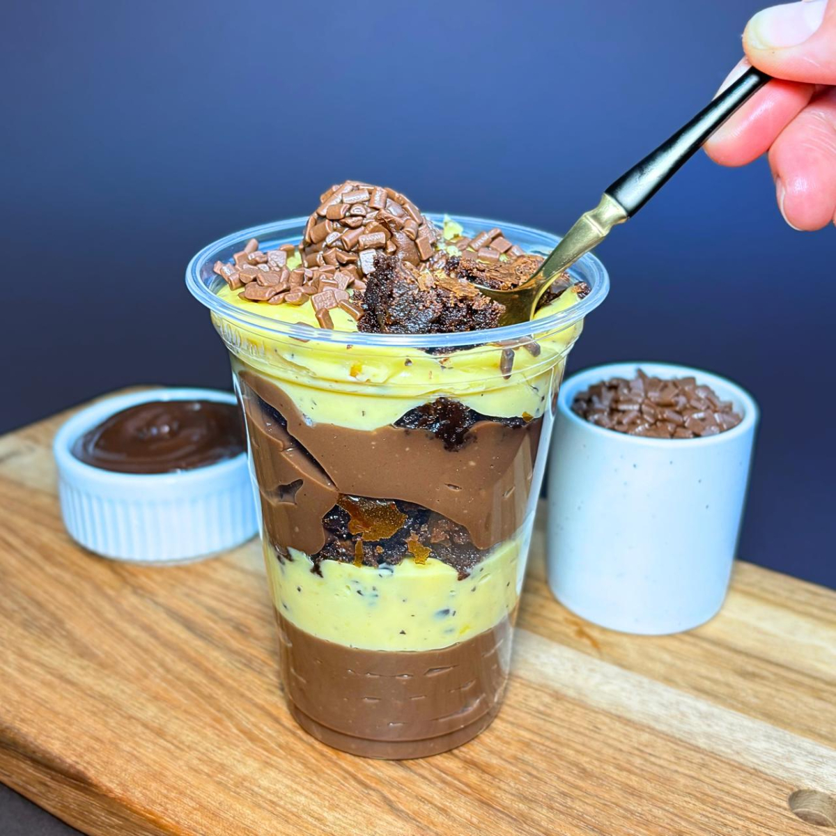 Um copo recheado com camadas de mousse de maracujá, brigadeiro ao leite cremoso e pedaços de brownie suculento. Finalizado com granulado de chocolate, docinho e brownie.