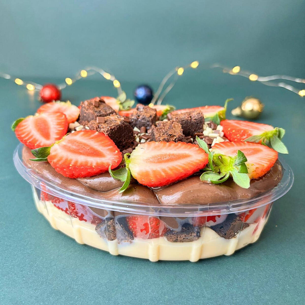 Travessa de Brownie com Morango feita com camadas de brigadeiro branco cremoso que se intercalam com pedaços generosos de brownie macio e chocolatudo, morangos frescos e suculentos e brigadeiro ao leite. A finalização fica por conta de mais brownie e morangos por cima, deixando a travessa ainda mais bonita e irresistível.
