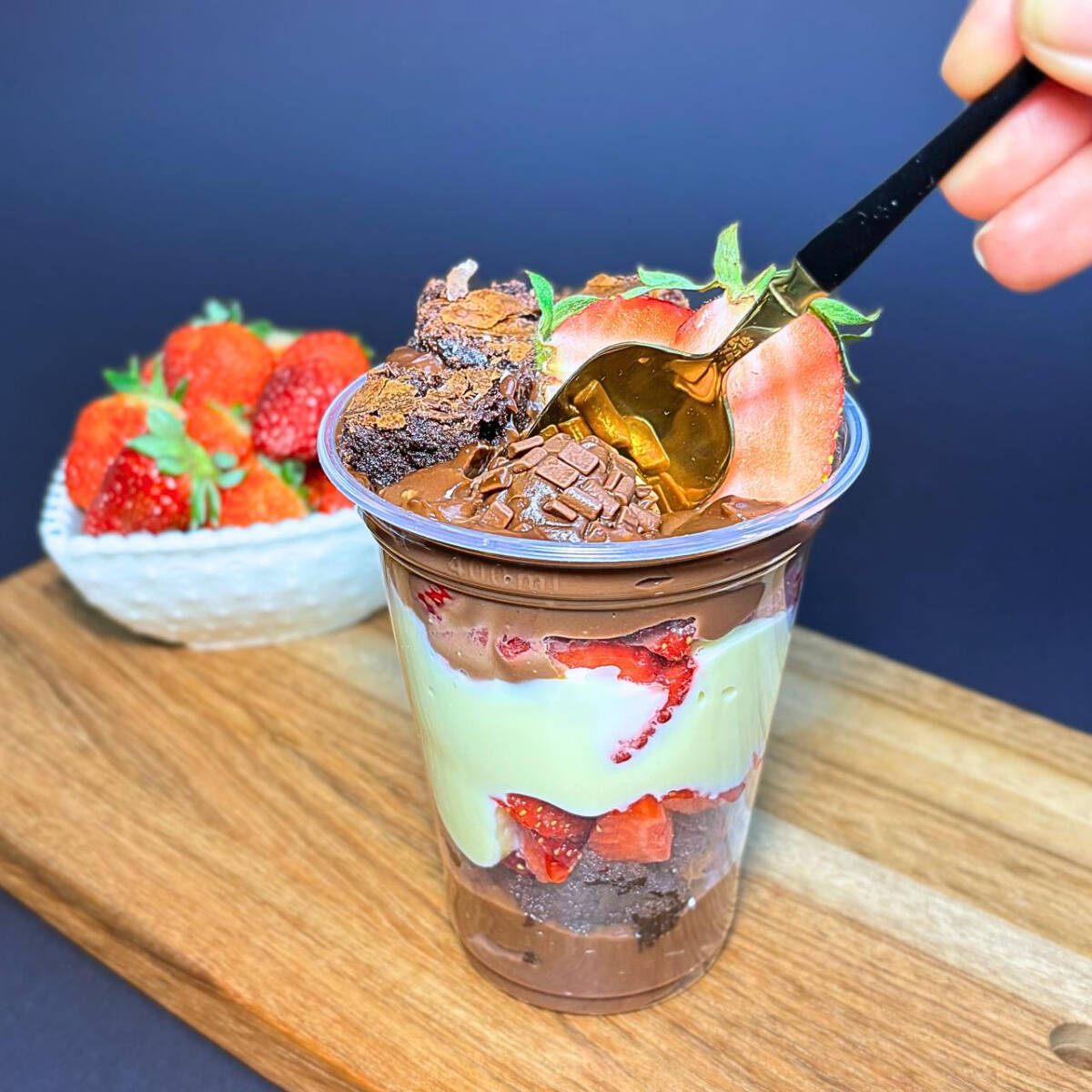 Um copo recheado com camadas de brigadeiro cremoso branco e ao leite, pedaços de brownie suculento e morango. Finalizado com brownie, docinho e morango.