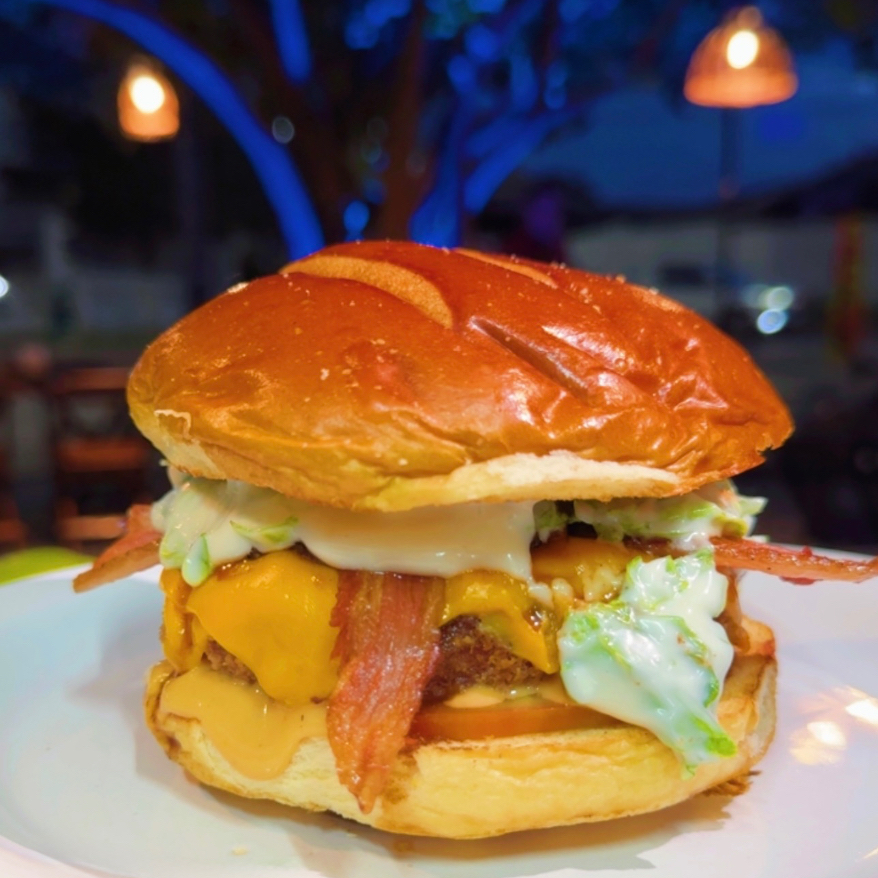 'Sinhazinha Burger' traz uma deliciosa combinação de um suculento burger de 180g, queijo mussarela empanado crocante, fatias de bacon, uma deliciosa geleia de maracujá, cebola caramelizada, picles, alface e tomate.