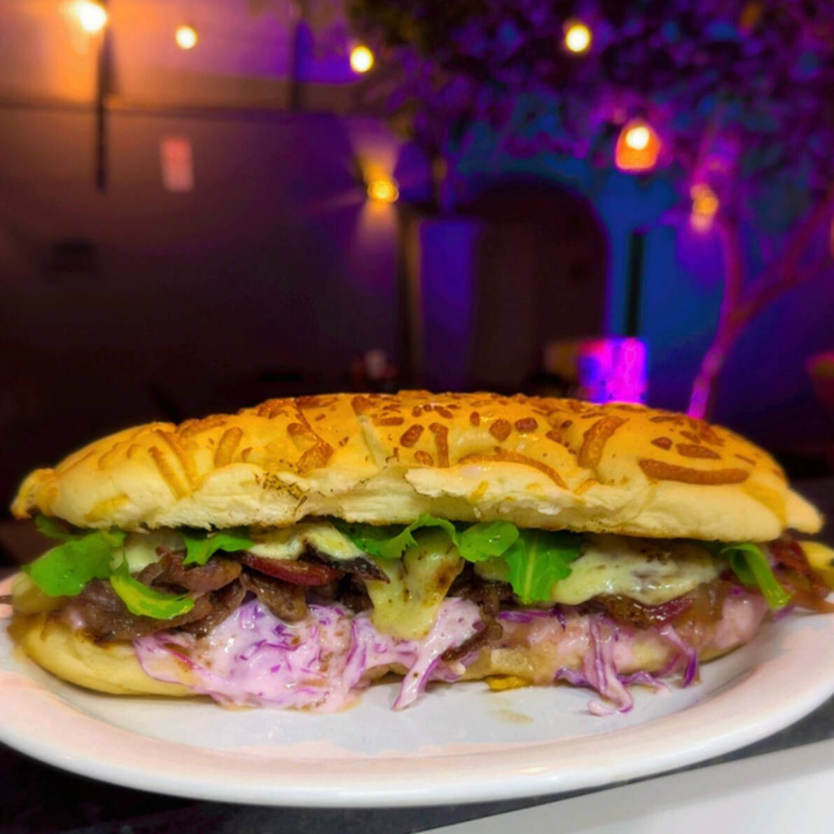 Pão Baguete, 180g Ancho do Contra Filé, Geleia de Abacaxi, Chimichurri Fresco, Queijo Mussarela, Pasta de Alho do Lima´s, Bacon, Rúcula, Tomate e Maionese de Repolho Roxo