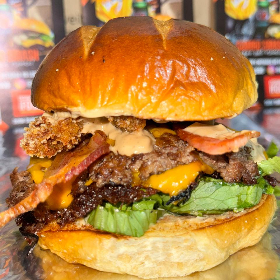 'Onion Crispy Smash' montado com um pão brioche, recheado com dois Smash Burger de 80g cada, duas fatias de cheddar, cebola roxa, fatias de bacon crocante, crispy de cebola, picles, tomate e alface. Para finalizar acrescentamos nosso excepcional molho da casa.