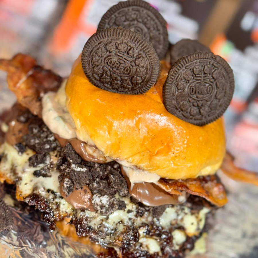 Smash Burger de Oreo e Nutella, montado no macio pão brioche, acompanhado de dois suculentos Smash Burger de 80g cada, queijo mussarela e a doçura da Bolacha Oreo e o irresistível creme de avelã de Nutella.