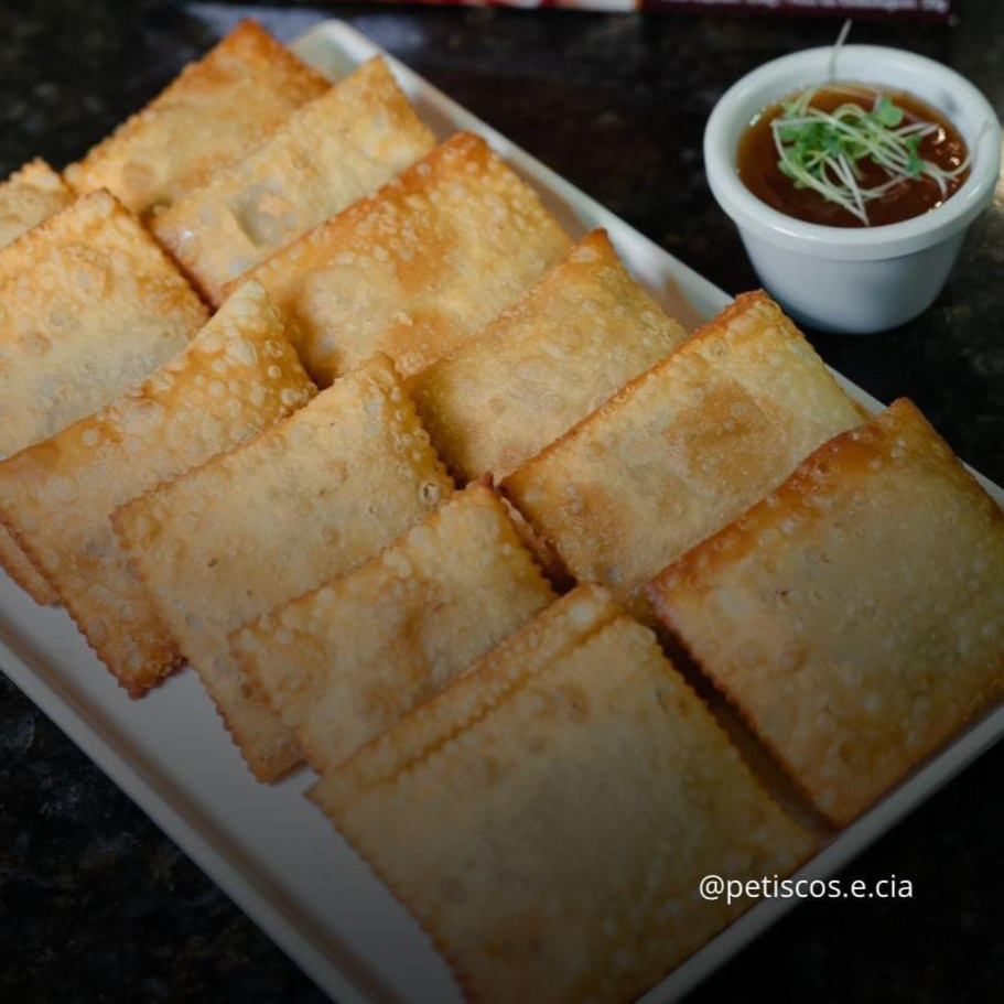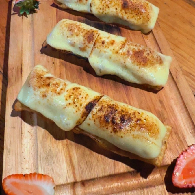 Deliciosa sobremesa feita de queijo coalho e goiabada quentinhos e cremosos envoltos numa crocante massa de pastel cobertos por queijo mussarela maçaricado.