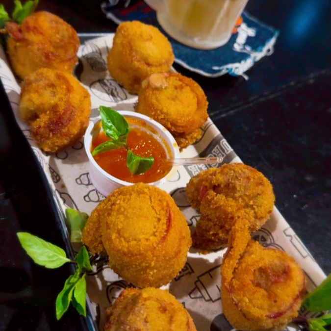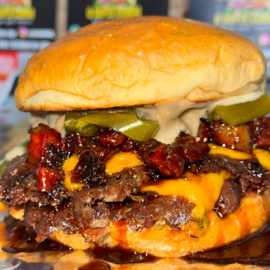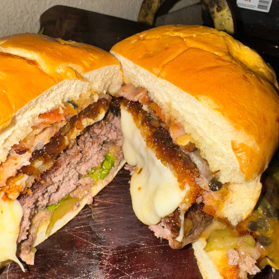 Smash de 50g cada, recheado com queijo mussarela e enrolado com um bacon crocante. 8 unidades